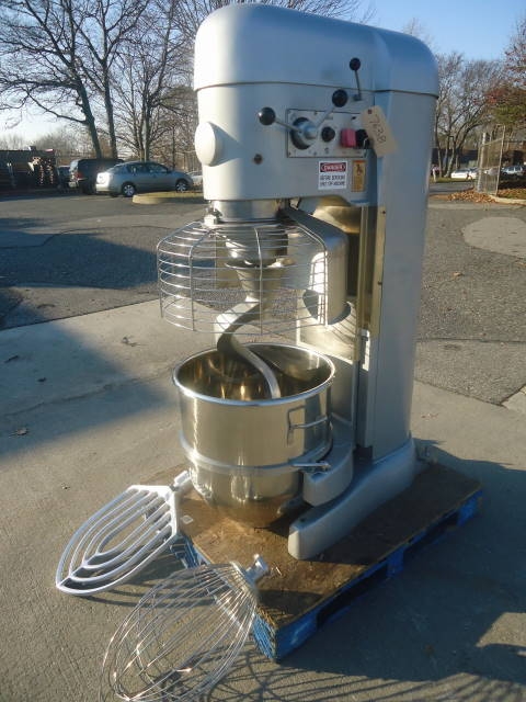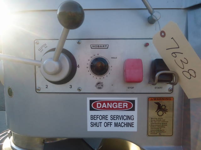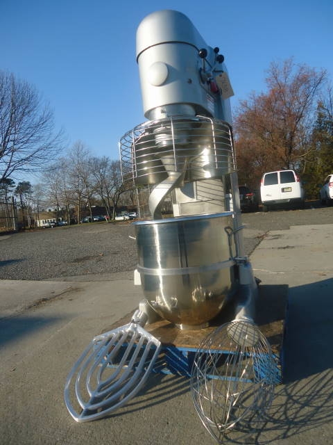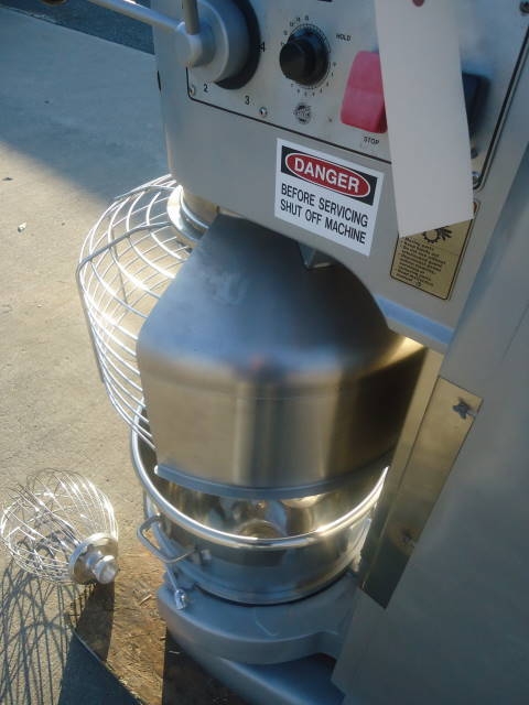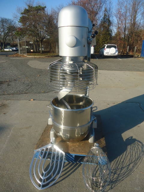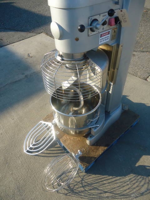 1 – USED HOBART MODEL V1401 140QT VERTICAL BOWL MIXER, SERIAL# 31-1160-601. THIS MIXER, WHICH HAS BEEN FACTORY REBUILT, HAS 23 IN. DIAMETER STAINLESS STEEL POLISHED BOWL AND COMES EQUIPPED WITH FLAT BEATER, HOOK, AND WHISK MIXING ATTACHMENTS. DRIVEN BY 5HP, 3 PHASE, 60 CYCLE MOTOR, UNIT HAS MULTIPLE SPEEDS, AUTOMATIC LIFT AND SAFETY GUARD. (STOCK# 7638)