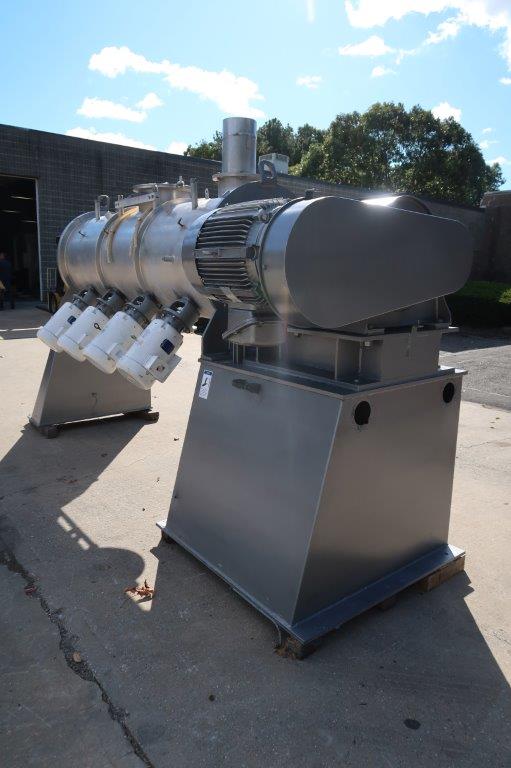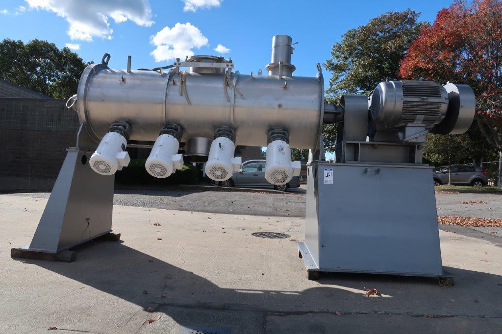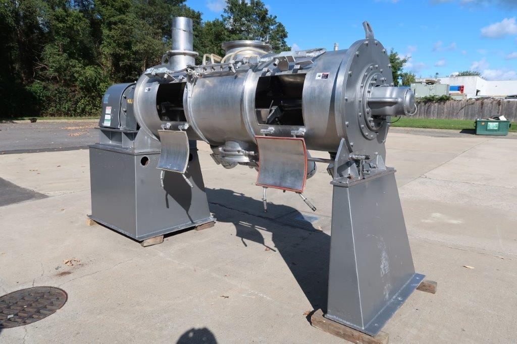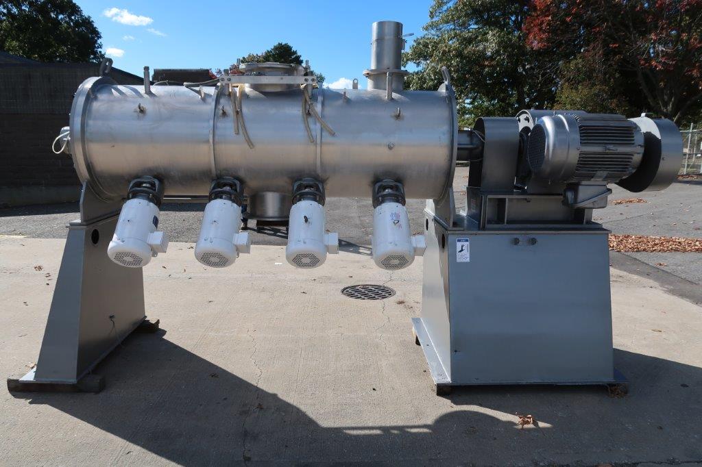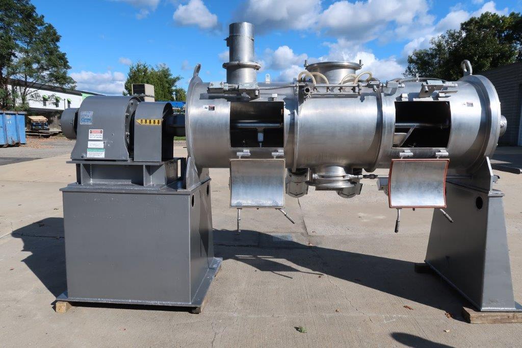 1-Used Littleford FKM-1200 Stainless Steel Plow Mixer, Serial number 1559. This 1,200 Liter unit was last used in the pharmaceutical industry, machine has 40HP Explosion-proof main drive motor. With four choppers each individually driven by 10 HP 3/60/208-230/460 Volt motors. With liquid injection, machine has approximately 12 In. diameter center discharge. (Stock #8792C)