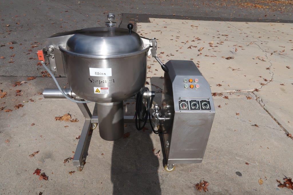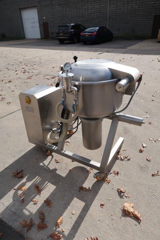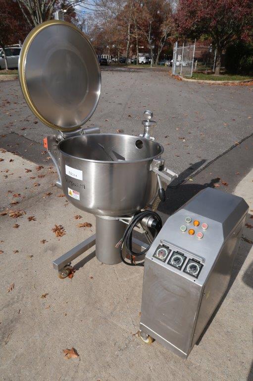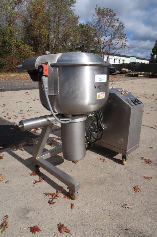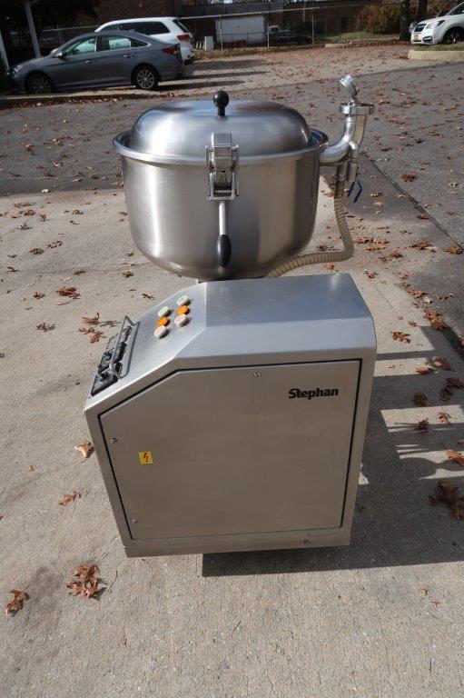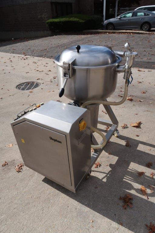 1-Used Stephan Model VM-100 Stainless Steel Vertical Mixer, S/N 717.918.02. This 100 liter vertical mixer was last mixing ground beef and is vacuum capable (requires a vacuum pump). With stainless steel base and hinged lid, mixer has underdriven agitator driven by 1.1kW, 3/60/208 Volt motor. On casters for portability. (Stock #8803B)