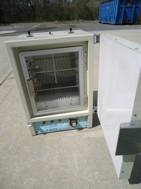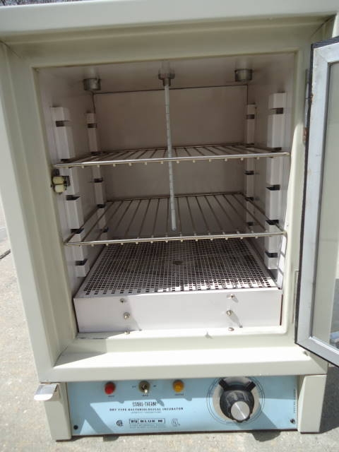 1-Used blue m “stabil-therm” dry type bacteriological incubator, model 100a, s/n ia302. Unit has interior dimensions of approximately 12 inches wide by 12 inches long by 15 inches high. With temperature control, incubator has two shelves, but could accept additional shelves. Rated temperature range 30 deg. C to 65 deg. C (149 deg. F.). Electrical specifications single phase, 60 cycle, 120volt. (stock#7777w)