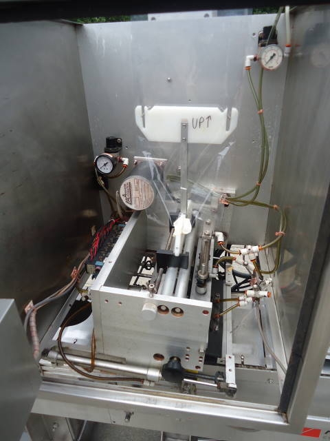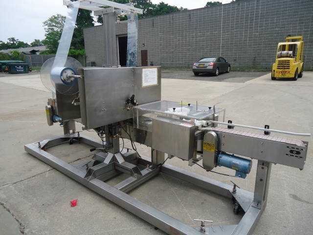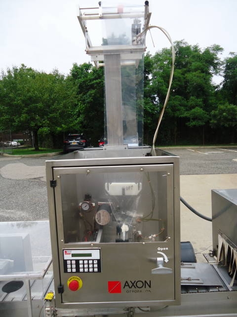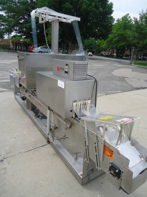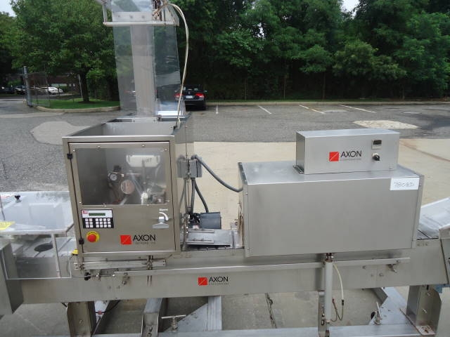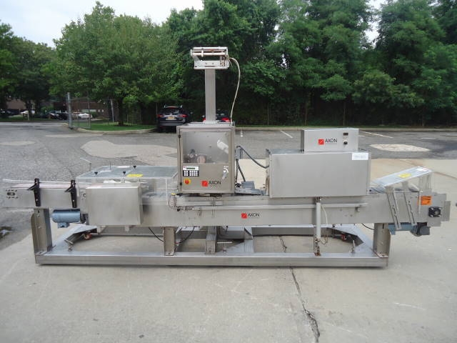 1-Used axon model ez-300 automatic sleever/tamper evident bander, s/n e-00777. Rated up to 70 containers per minute, machine has single phase, 60 cycle, 110 volt electrics. Mounted on stainless steel framework with approx. 6 in. Wide x 35 in. Long infeed belt. System comes equipped with axon ez 36-br shrink tunnel. With front mounted digital control pad, machine last used on approx. 4-1/4 in. Diameter cup. (stock #7808d)