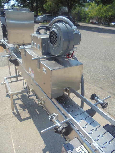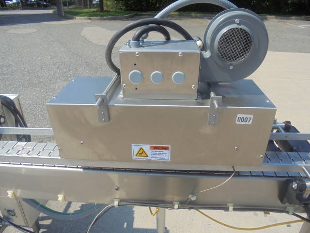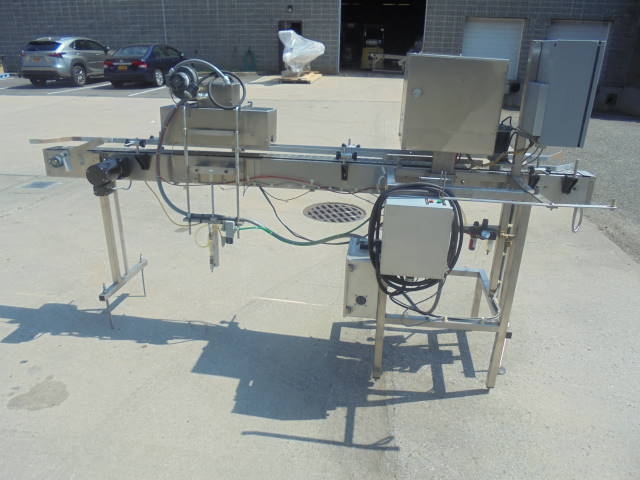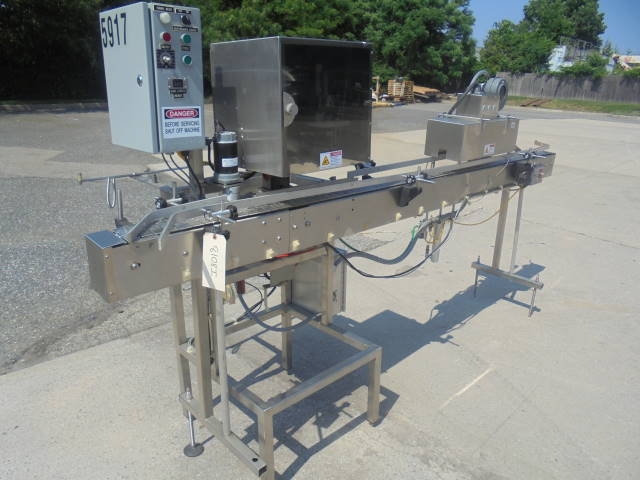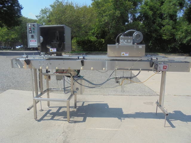 1-Used Marburg Industries Conveyorized Neck Bander and Shrink Tunnel. This unitized System is mounted on stainless steel structure and has approx. 4-1/2 in. wide stainless steel tabletop conveyor chain. Last used on small bottles, Shrink Tunnel has opening measuring approx. 1-3/4 in. wide and overall length of System is approx. 115 in. With variable speed control, last used in pharmaceutical operation. (Stock # 8108i)