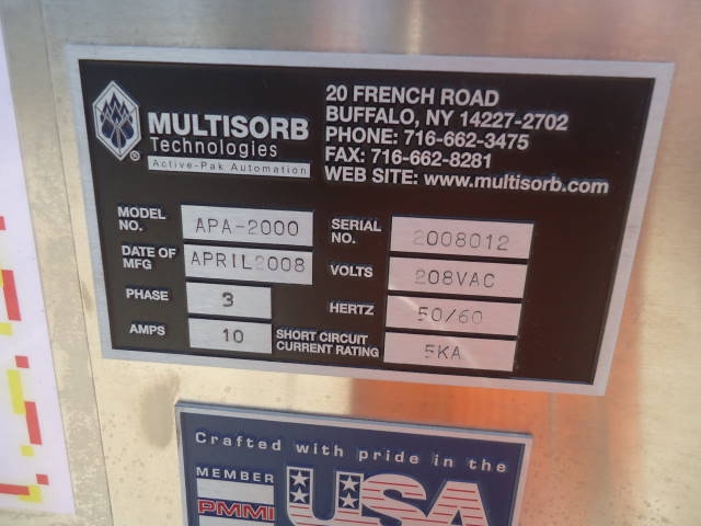 1-USED MULTISORB TECHNOLOGIES (ACTIVE-PAK AUTOMATION) MODEL APA-2000 AUTOMATIC DESICCANT DISPENSER, S/N 2008012. PREVIOUSLY OPERATED IN A BOTTLING LINE OF DECONGESTANT TABLETS, THIS TWO COMPONENT DISPENSER IS ON CASTERS FOR PORTABILITY AND HAS ALLEN BRADLEY PANELVIEW 600 CONTROLLER. ELECTRICAL SPECIFICATIONS: 3 PHASE, 50-60 CYCLE, 208 VOLT. WITH ASSORTED CHANGE PARTS. (STOCK # 7506J)