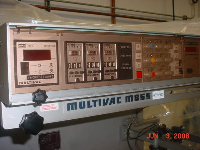 1-Used multivac model m855f-pc thermoforming machine. This “map” machine has 356mm width and was last operated in food processing. Electrical specifications: 3 phase, 60 cycle, 220 volt. (stock # l1147)