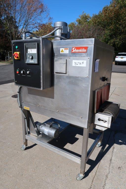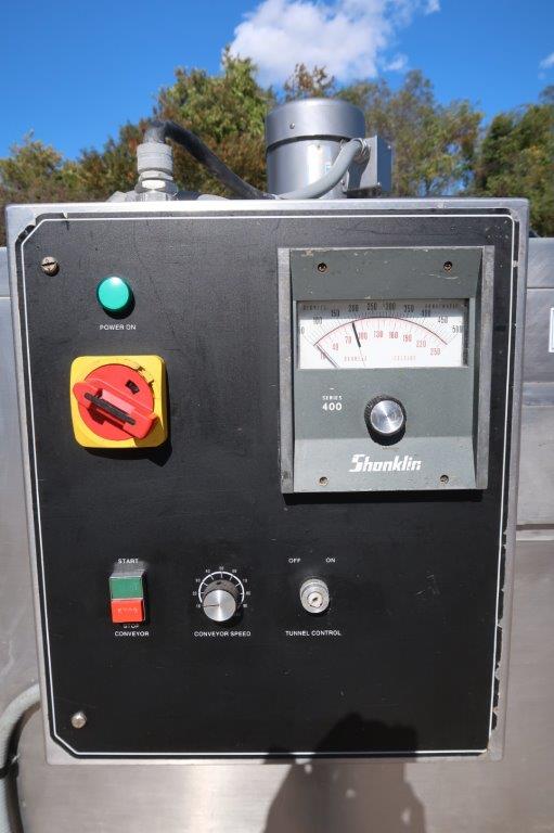 1-Used Shanklin Model T-7XL-SS Stainless Steel Shrink Tunnel, Serial Number T-97292. On casters for portability, this tunnel has 12 In. wide belt and tunnel opening of approximately 21 In. wide X 8-1/2 In. high. With front mounted control panel with temperature gauges and variable speed controls. With fractional HP belt motor and top mounted 3/4 HP blower motor, tunnel has 3/60/230 Volt electrics. Last used in the food industry. (Stock #8696F)
