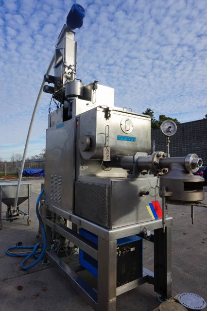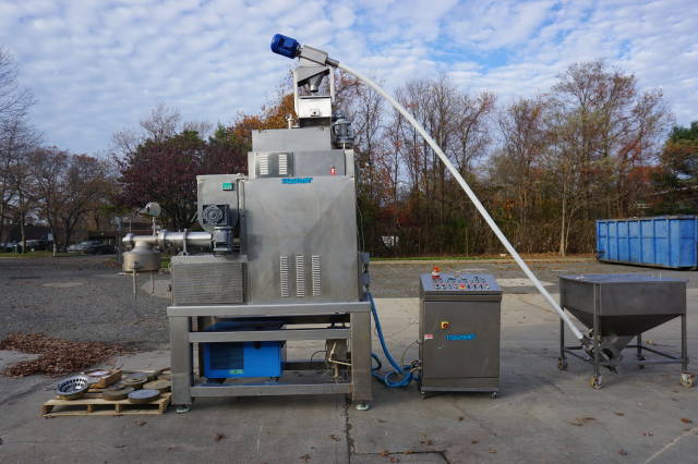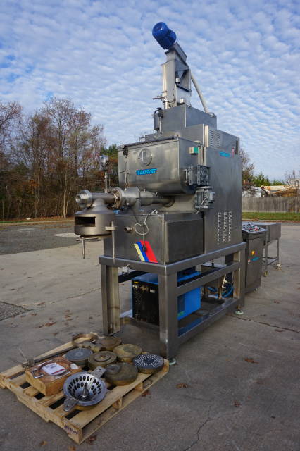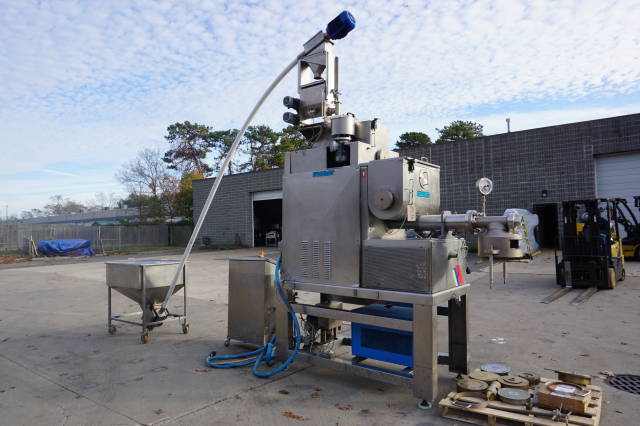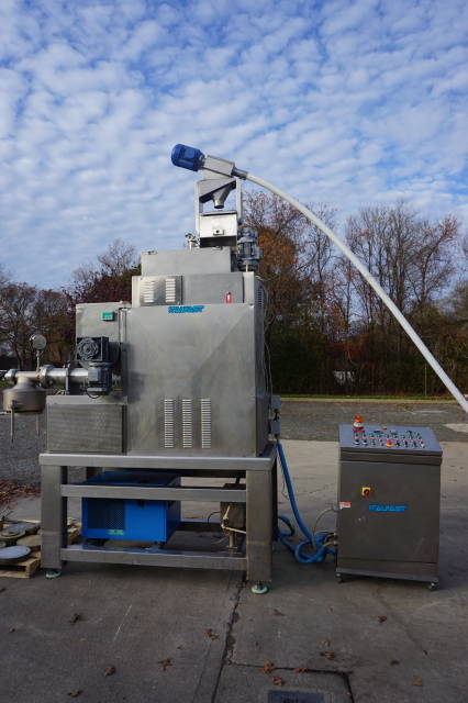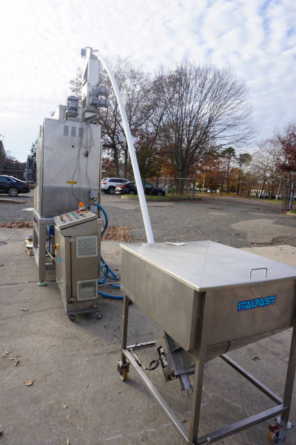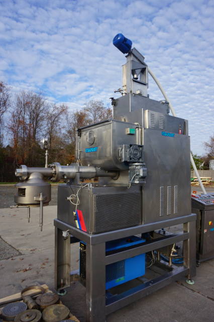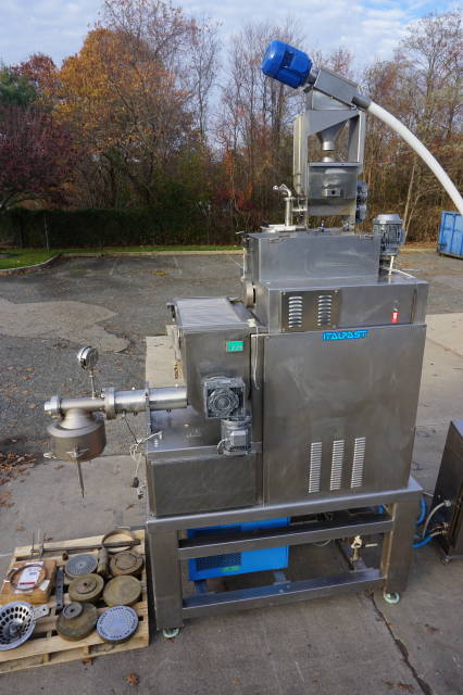 1-Used Italpast Model MAC 300 TV Continuous Pasta Extruder, S/N 426006. Suitable for short and long pasta with output up to over 350 kilograms per hour. Equipped with top mounted 15 In. X 30 In. X 20 In. stainless mixing basin, Machine comes equipped with floor mounted hopper with flexible screw feeder for the feeding of the flour and miscellaneous assorted dies. Equipped with control panel, electrical specifications 3/60/220 Volt. (Stock #8323A)