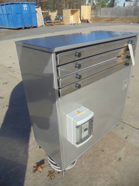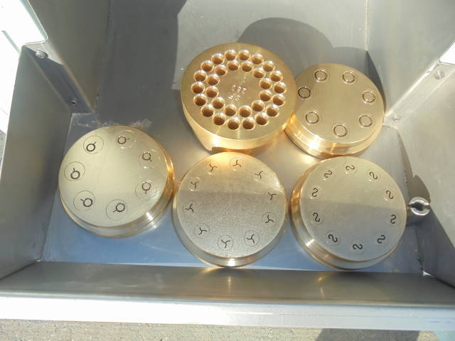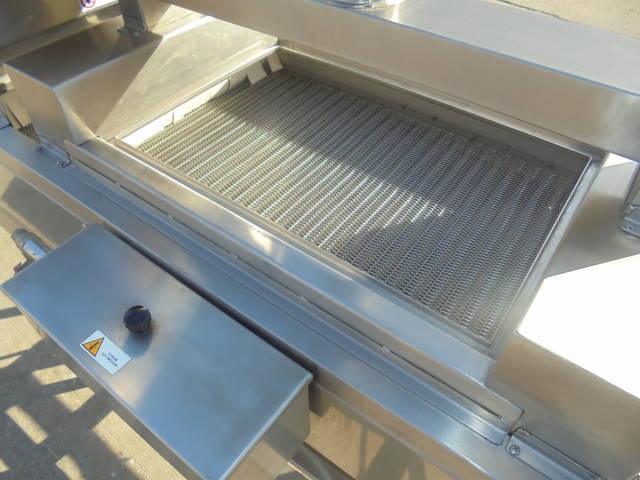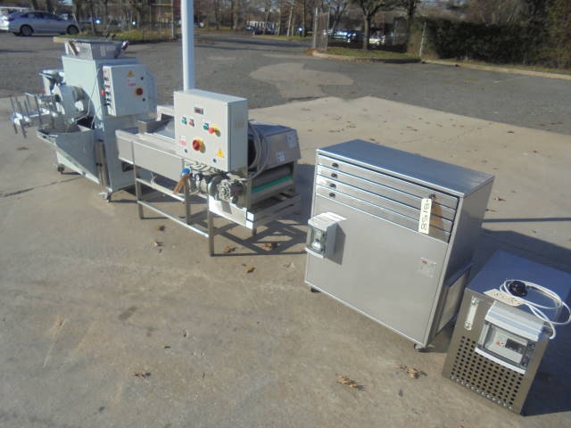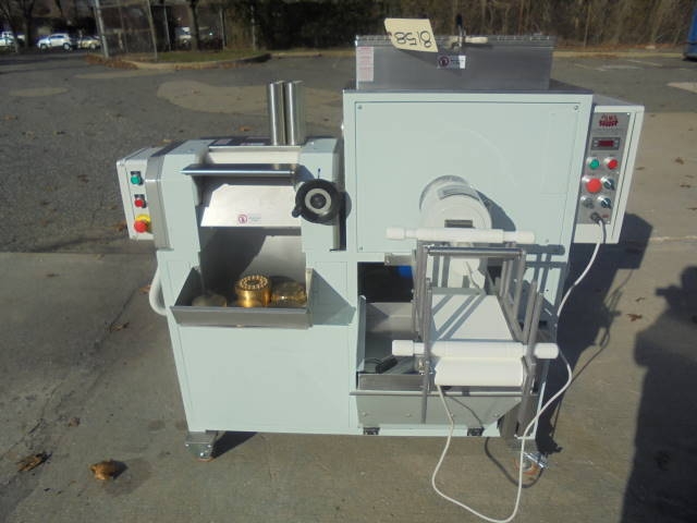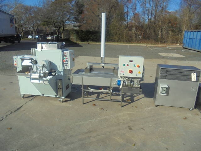 1-Used Pama Roma Fresh Pasta Manufacturing Line. Line Consists of Model P/25-C Pasta Mixer/Press/Extruder with motorized cutting head (with 12 inch by 20 inch top mixing hopper, with safety grate) and takeaway conveyor, Model PS150 Stainless Steel Pasteurizer, Serial number 3388 (with 15 inch wide by 55 inch long stainless mesh belt conveyor) Model PR/4 Pre-Dryer and Refrigeration/Chiller Unit, serial number 1168. Supplied with assorted Dies for different pastas. Line was minimally used, thus leaving it in excellent condition. Pasta Press produces 25 kilos per hour (55 pounds per hour). Electric specifications of line 3 phase 60 cycle 208 volt. (Stock #8158)
