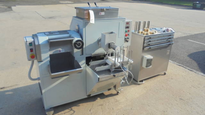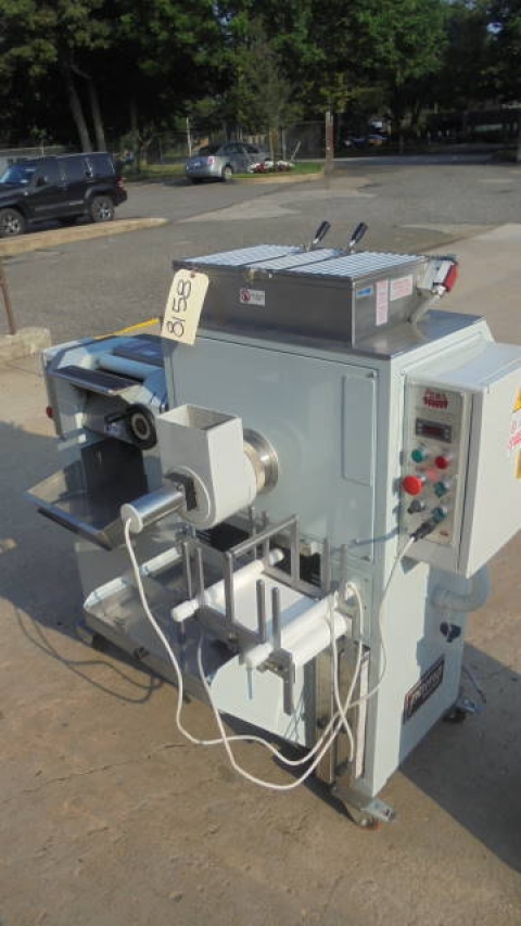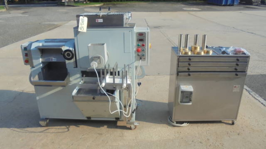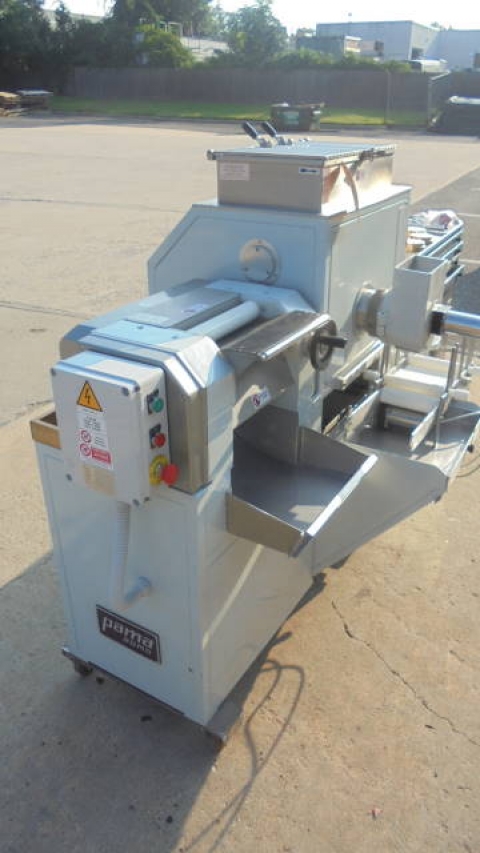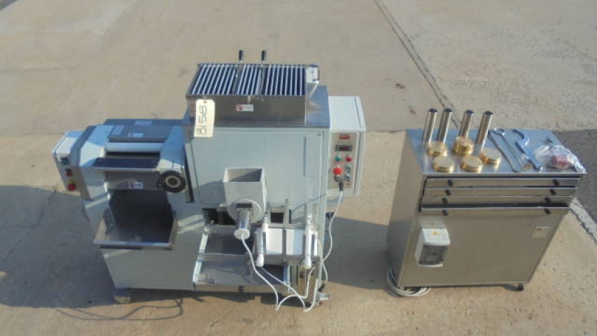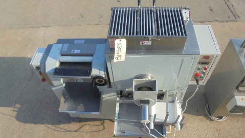 1-Used Pama Roma Model P25/C Pasta Extruder/Press, S/N 3386. Rated up to 55 Lbs./hour capacity (25 kilos per hour), machine has top mounted stainless steel 20 In. X 12 In. mixing hopper, with safety grate. Supplied with 6 assorted dies, machine has motorized cutting head, and approximately 7 In. wide takeaway conveyor for finished product. On casters for portability, electrical specifications 3/60/208 Volt. Supplied with Model PR/4 pre-dryer cabinet with drawers. (Stock #8158XX)