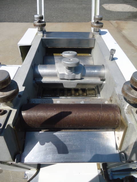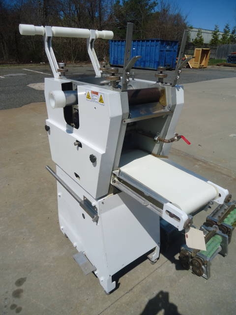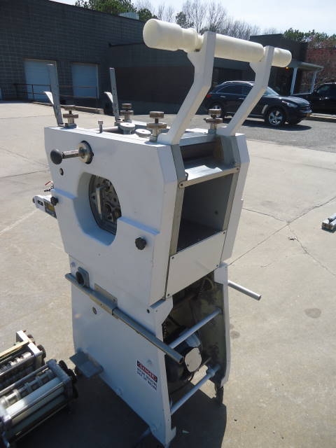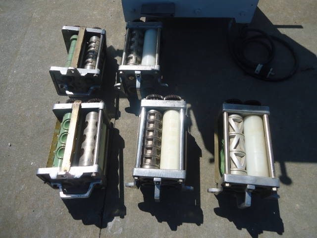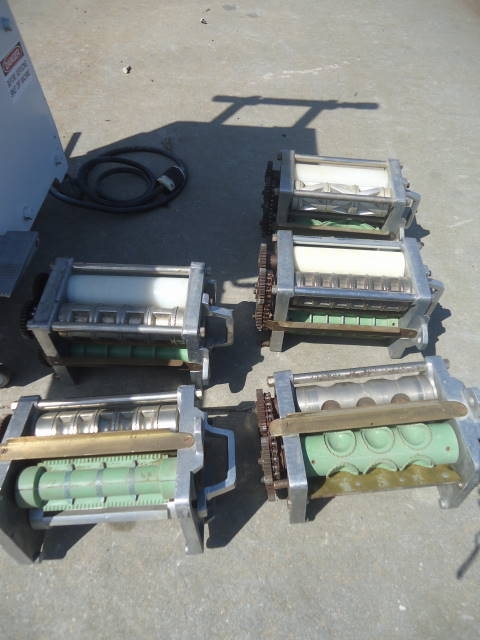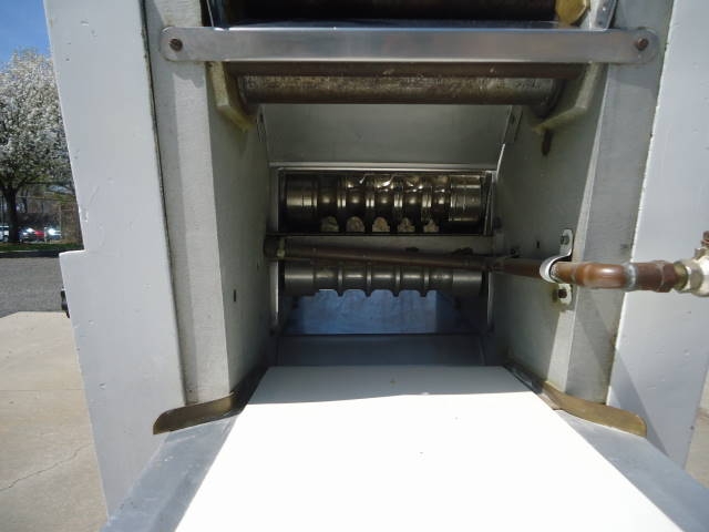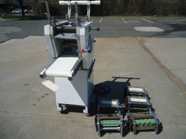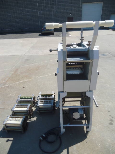 1-USED RAVIOLI MACHINE, INCOMPLETE.  MACHINE ON CASTERS FOR PORTABILITY.  9-1/2 IN. WIDE TAKE AWAY BELT.  COMES EQUIPPED WITH SIX (6) ASSORTED DIES FOR RAVIOLI AND OTHER TYPES OF PASTA, BUT IS INCOMPLETE AS IT DOES NOT HAVE TOP PORTION WHICH FILLS PASTA.  (STOCK #7783A)