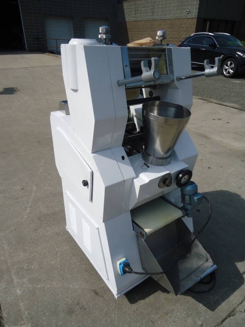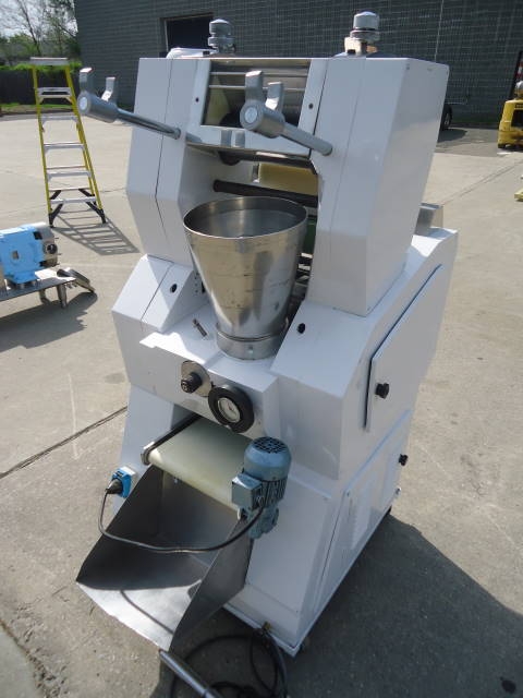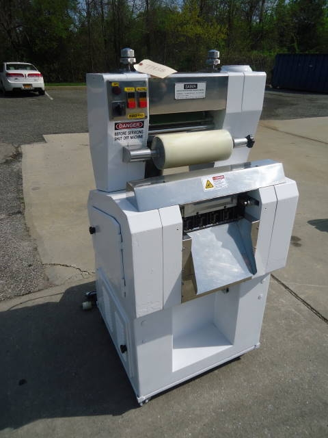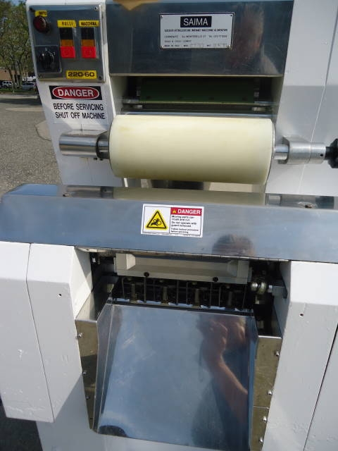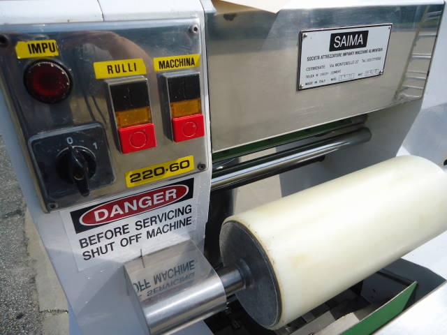 1-USED SAIMA MODEL T4/B TORTELLINI/TORTELLINO MACHINE, SERIAL NUMBER B4/3.  THIS 265mm WIDE MACHINE IS RATED UP TO 60 KG PER HOUR.  WITH FEED HOPPER, MACHINE IS ON CASTERS FOR PORTABILITY.  ELECTRICAL SPECIFICATIONS 3 PHASE, 60 CYCLE, 220VOLT. (STOCK#7783B)
