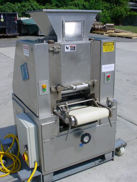 1-USED TORESANI APPROX. 300MM WIDE PASTA SHEETER. ON CASTERS FOR PORTABILITY, SHEETER HAS STAINLESS STEEL HOPPER WITH INTERNAL MIXING ARMS. EQUIPPED WITH INDEPENDENT DRIVES, ONE FOR MIXING ARMS AND ONE FOR SHEETING ROLLS. LAST USED IN RAVIOLI PRODUCING PLANT. EQUIPPED WITH BELT TAKE AWAY CONVEYOR.