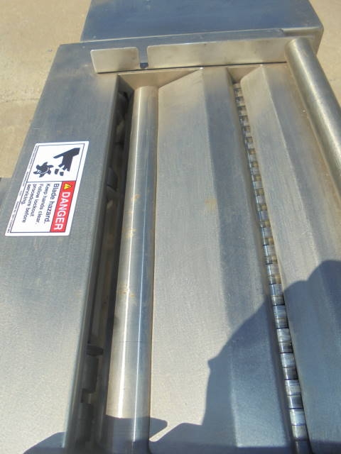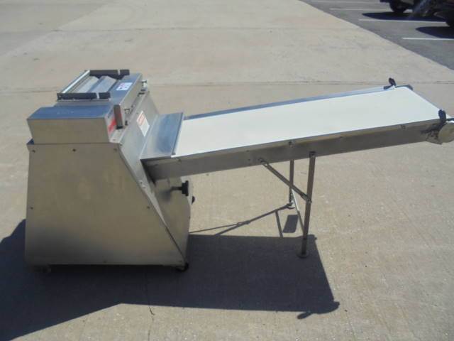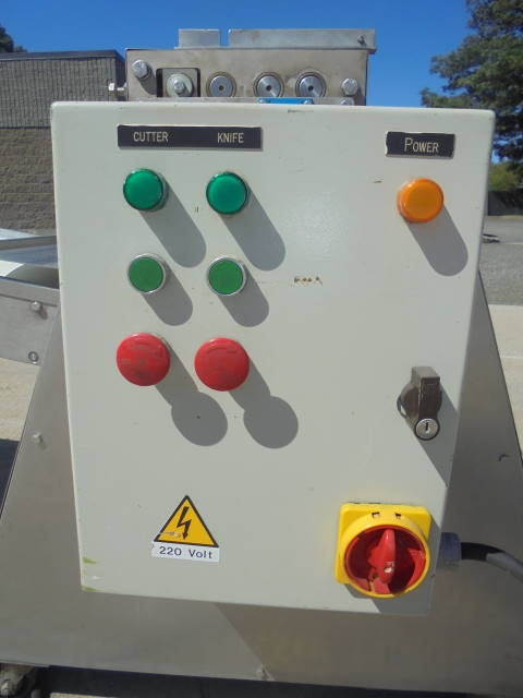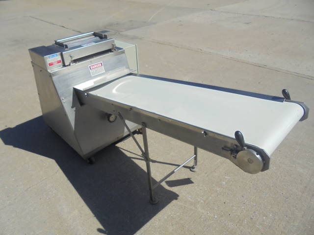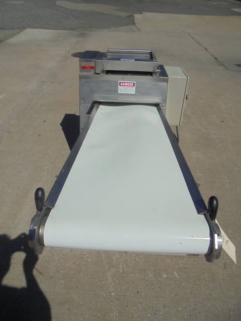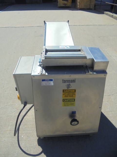 1-Used Toresani Model TCT-350 Stainless Steel Pasta Cutter Type 89/2825. Equipped with approx. 16 in. wide white food grade belt. Cutter has approx. 55 in. long take away conveyor and “push button” starter box. On casters for portability. Electrical specifications: 3/60/220 volt. Requires top hopper. (Stock #7814R)