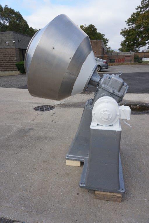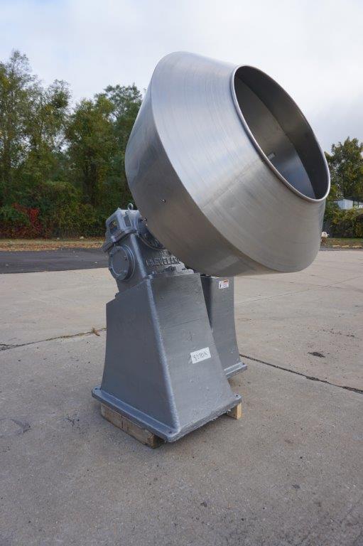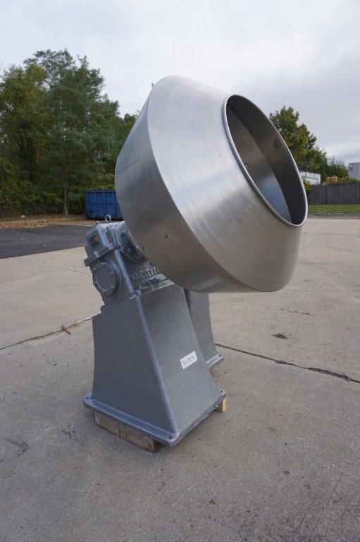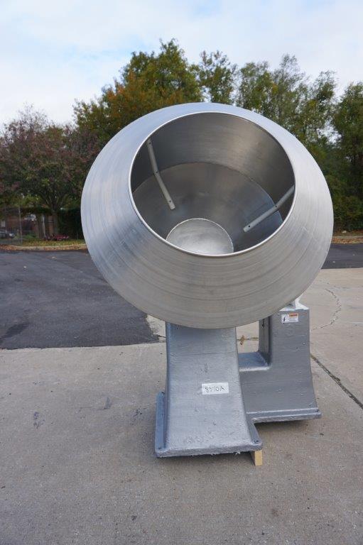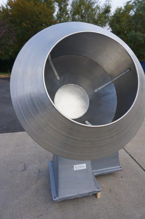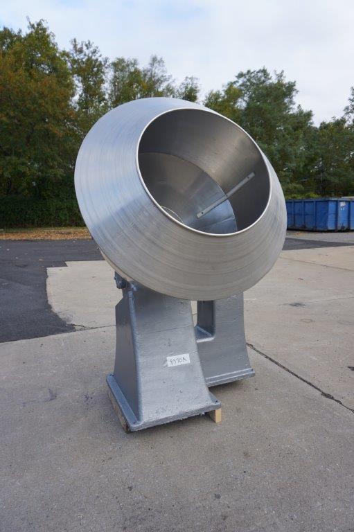 1-Used 42 In. Diameter Stainless Steel Coating Pan.  Last used in the vitamin industry, Pan is equipped with internal baffles.  Mounted on stand, Pan is driven by 3/60/220-440 Volt explosion proof motor.  (Stock #8570A)