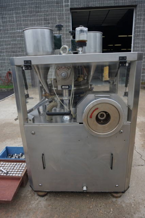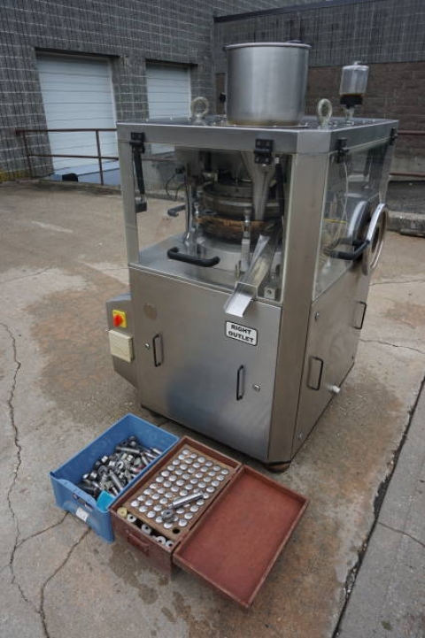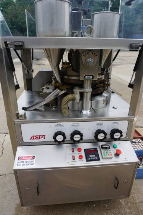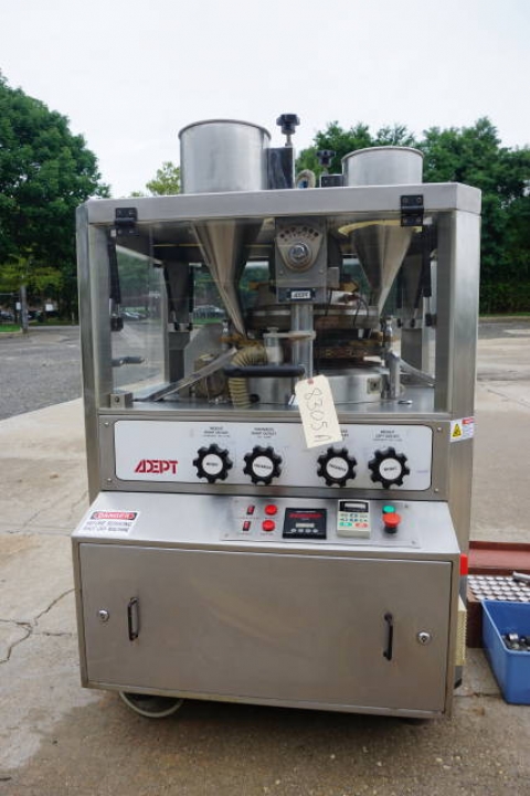 1-Used Adept 25 Station Rotary Tablet Press, Model ADR D-D-25, S/N 200724. Rated up to 90,000 tablets per hour (1,500 tablets per minute), Press was last producing “D” tablets and comes equipped with a full set of tooling. Machine rated 20,000 Lb. pressure and is equipped with dual hoppers. This GMP machine has keyed head and is equipped with a Tablet Counter, speed control and adjustments for weight and thickness of tablets. (Stock #8305A)