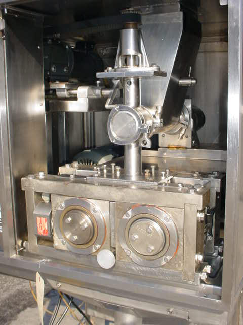 1-USED FITZPATRICK MODEL L-83 CHILSONATOR ROLL COMPACTOR. LAST USED IN VITAMIN PRODUCTION, MACHINE HAS 1-1/2" WIDE X 8" DIAMETER HORIZONTALLY GROOVED ROLLS DRIVEN BY 5 HP 3/60/230-460 VOLT MOTOR. WITH STAINLESS STEEL HORIZONTAL AND VERTICAL FEED SCREWS, EACH INDEPENDENTLY DRIVEN BY FRACTIONAL HP MOTORS. MOUNTED ON STAINLESS STEEL BASE.