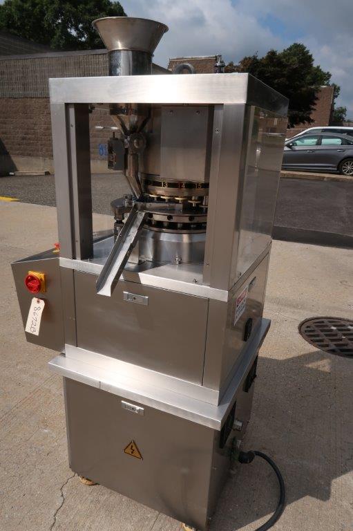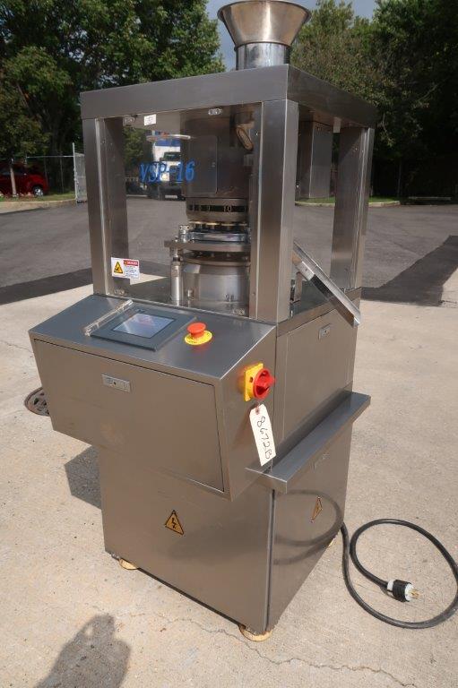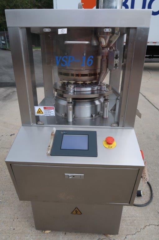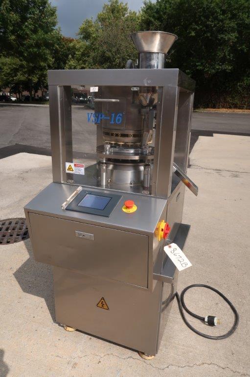 1-Used Vanguard Model VSP-16 Rotary Tablet Press, S/N 204019. This 16 station GMP press is rated up to 28,800 tablets per hour and is equipped with top mounted stainless hopper. Presently equipped with tooling for approximately 7/16 In. diameter round tablet, machine is capable of producing up to 22mm diameter tablets. Equipped with gauges for controlling pre-compression, as well as tablet thickness and fill quantity. With stainless steel guarding , machine last used in the personal products care industry. Driven by 1.5 Kw drive motor. (Stock #8672B)