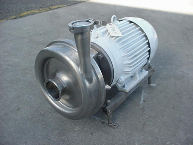 1-Used stainless steel sanitary centrifugal pump, inlet approx. 3″ diameter x 2″ diameter outlet. Driven by sterling 10hp 3/60/208-230-460 volt tefc motor.