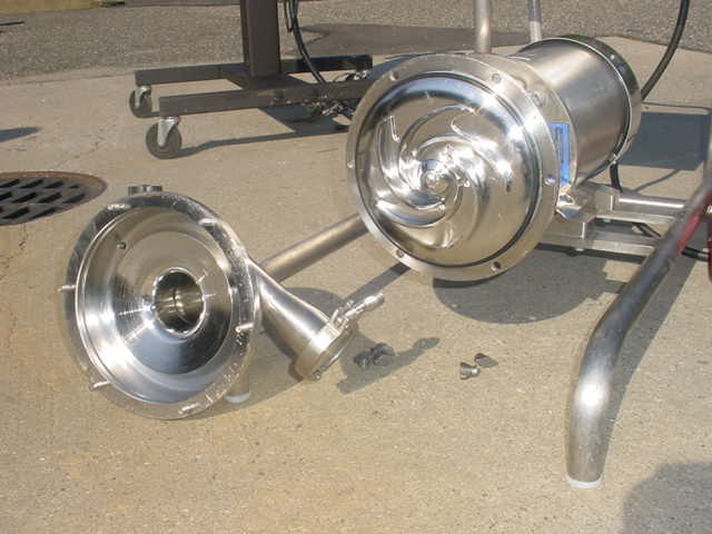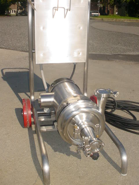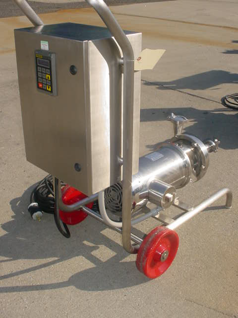 1-Used alfa laval flow “lkh” stainless steel sanitary centrifugal pump model lkh-10, s/n 01-4-58604. With approx. 2-1/2″ diameter inlet and 1-1/2″ diameter outlet, pump has approx. 6″ diameter impeller and is driven by 5 hp 3/60/208-230/460 volt stainless steel “wash down” motor. On stainless steel base with casters, pump has stainless steel control box with baldor digital keypad. (stock # 7417s)