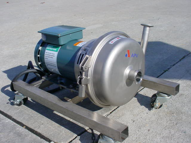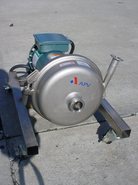1-Used apv stainless steel sanitary centrifugal pump, type w + 50/08, s/n 100308099. Equipped with approx. 1-1/2″ diameter inlet and 1″ diameter outlet. Both have tri-clamp fittings. On stainless steel stand with casters, pump driven by 1.5 hp 3/60/230-460 volt motor.