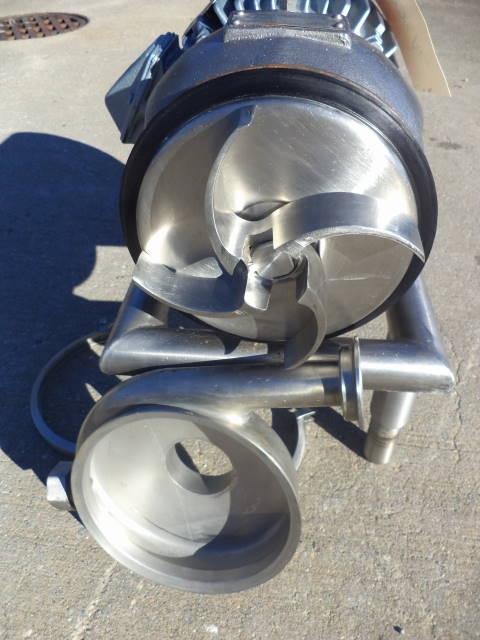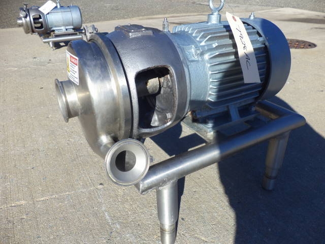1-Used Crepaco Stainless Steel Sanitary Centrifugal Pump, Serial Number 8V-82. On stainless steel base, pump has approximately 3 in. diameter inlet and 2 in. diameter outlet ports. Driven by 5HP 3/60/230-460 Volt motor. (Stock# 7928AC)
