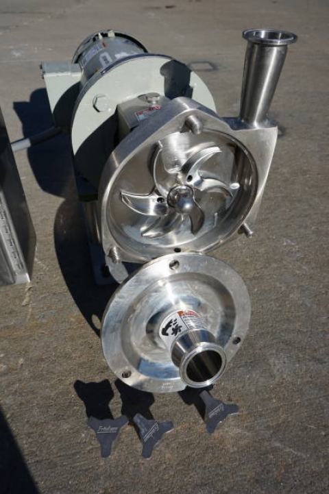1-Used Fristam Stainless Steel Sanitary Centrifugal Pump, Model FPX722-14S, S/N FPX7220903241.  Equipped with approx. 2-1/2 in. diameter tri-clamp inlet and approx. 1-1/2 in. diameter tri-clamp outlet.  Driven by 3 HP 3/60/208-230-460 volt motor.  Impeller diameter approx. 5-1/2 in.  (Stock #8252P)