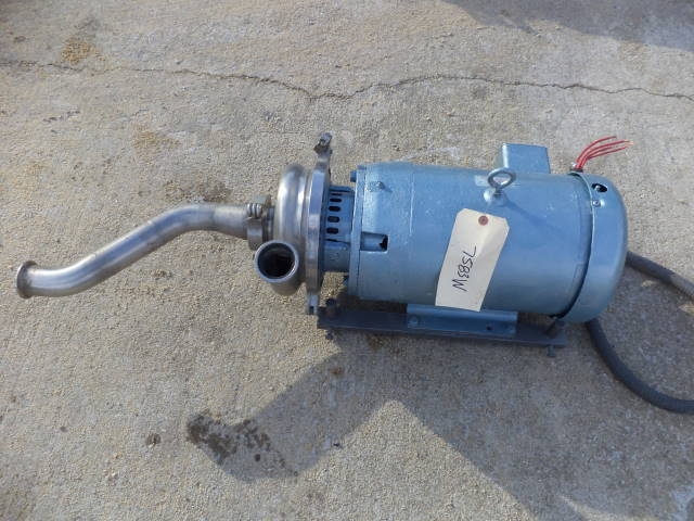 1-Used Waukesha Stainless Steel Sanitary Centrifugal Pump Model 2065, S/N 115491. Equipped with approx. 2 in. X 2 in. ports. Pump driven by 15 HP 3/60/208-230-460 volt motor. (Stock #7853W)