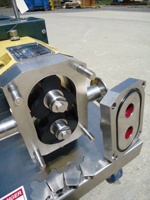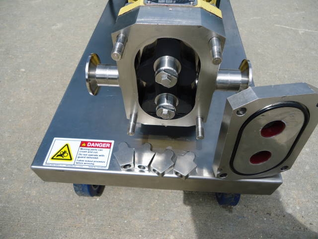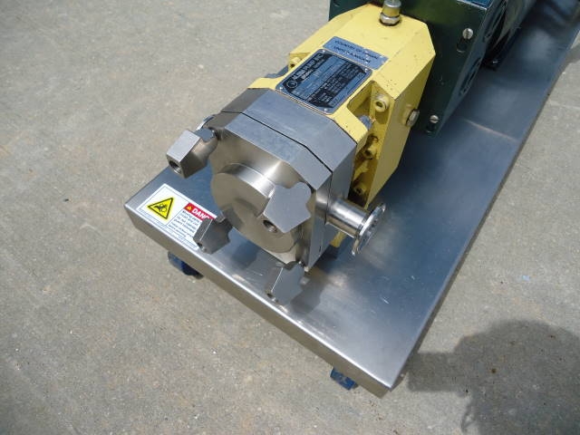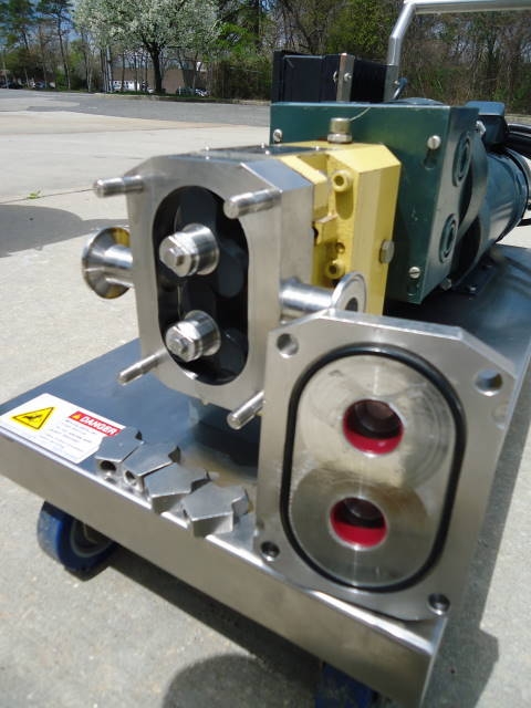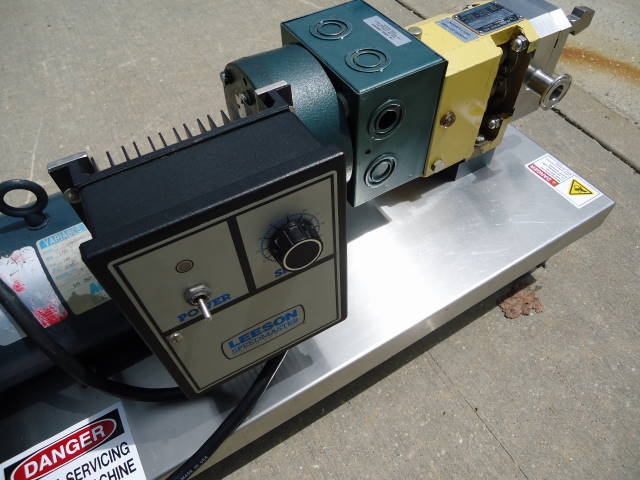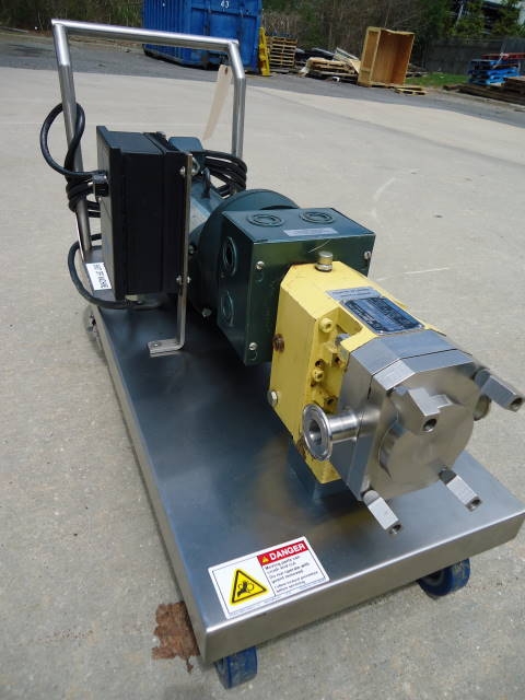 1-USED ALBIN MODEL 107 STAINLESS STEEL POSITIVE DISPLACEMENT GEAR PUMP, S/N 22263. ON STAINLESS STEEL PORTABLE BASE WITH CASTERS, PUMP HAS APPROXIMATELY 2 INCH OD INLET AND OUTLET PORTS. DRIVEN BY 2HP 3 PHASE, 60 CYCLE MOTOR, PUMP HAS LEESON “SPEEDMASTER” VARIABLE SPEED CONTROL. (STOCK# 7777J)