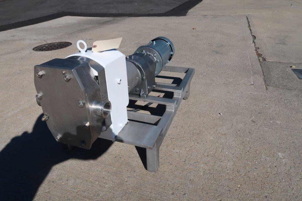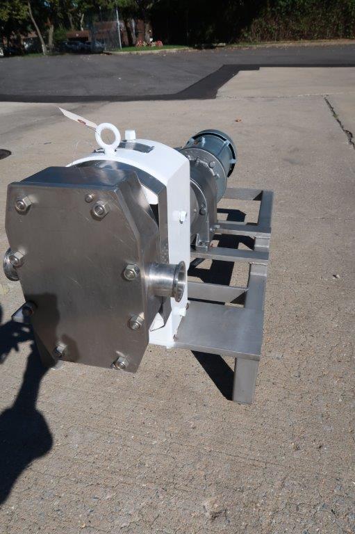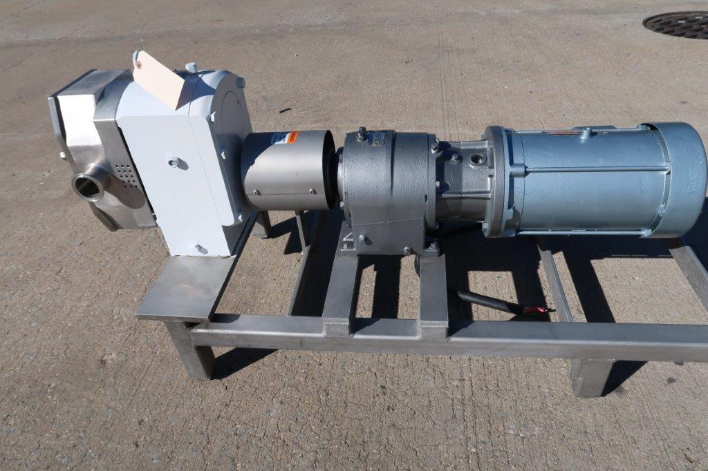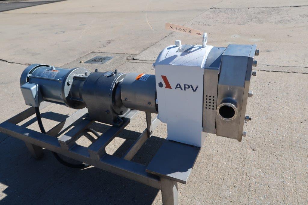 1 – Used APV Model R +4 Stainless Steel Positive Displacement Pump, S/N PP-12490399. Equipped with approx. 2 In. diameter inlet and outlet Tri-Clamp ports, pump is driven by 5 HP 3/60/230-460 volt motor. Mounted on Stainless Steel base, pump last used in the food industry.(Stock # 8504X)