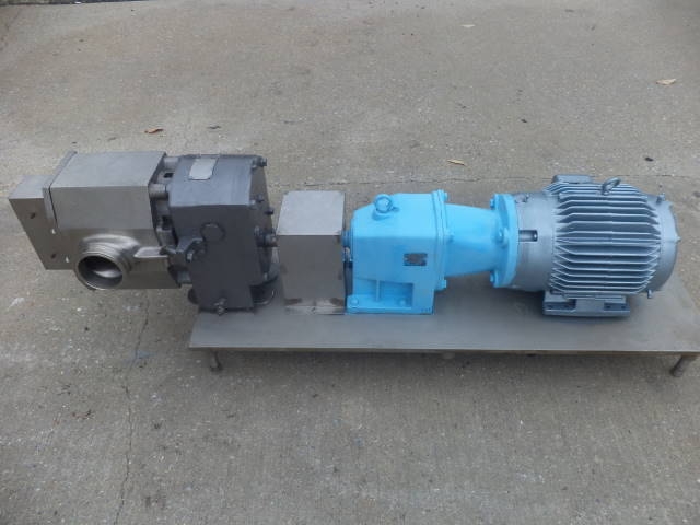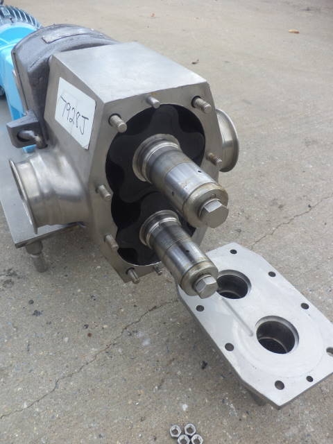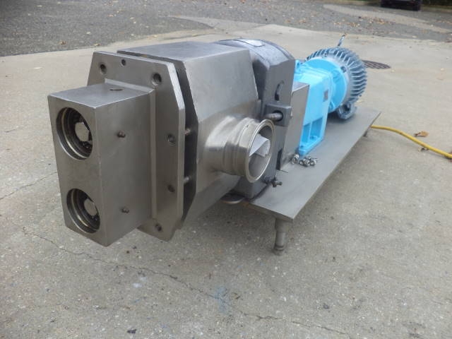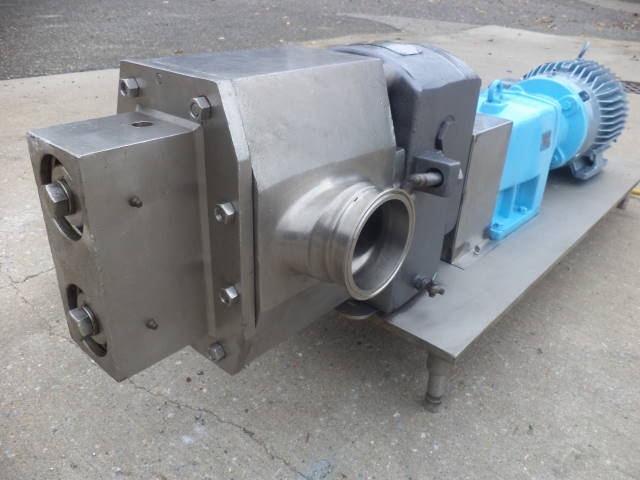 1-Used APV Model R700R Stainless Steel Positive Displacement Pump, S/N F-5879. Equipped with approx. 4 in. diameter inlet and outlet sanitary ports. Pump on stainless steel base and driven by 7.5 HP 3/60/230-460 volt motor. (Stock #7928J)