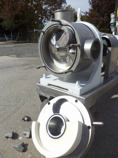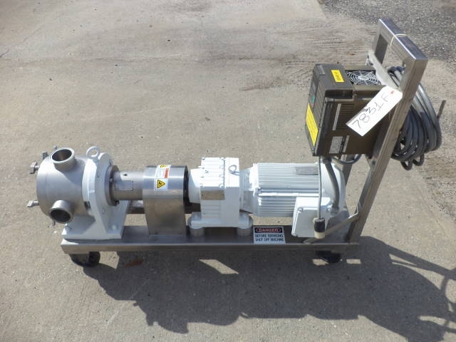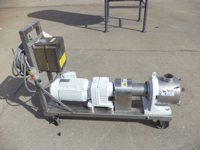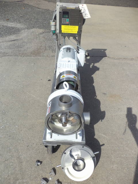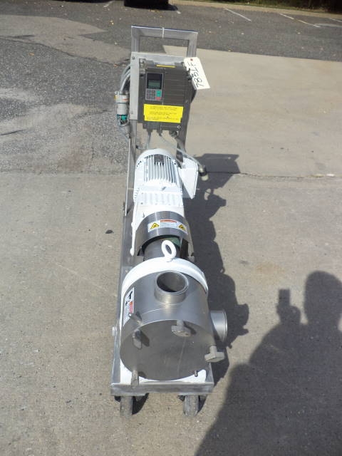 1-Used Sine Model MP130-NNTC Stainless Steel Positive Displacement Pump, S/N E000099-01. Equipped with approx. 3 in. diameter inlet and outlet port, Pump on stainless steel base with casters. Driven by Eurodrive 7.5 HP 3/60/230-460 volt gearmotor with Fuji electric speed control. (Stock #7831F)