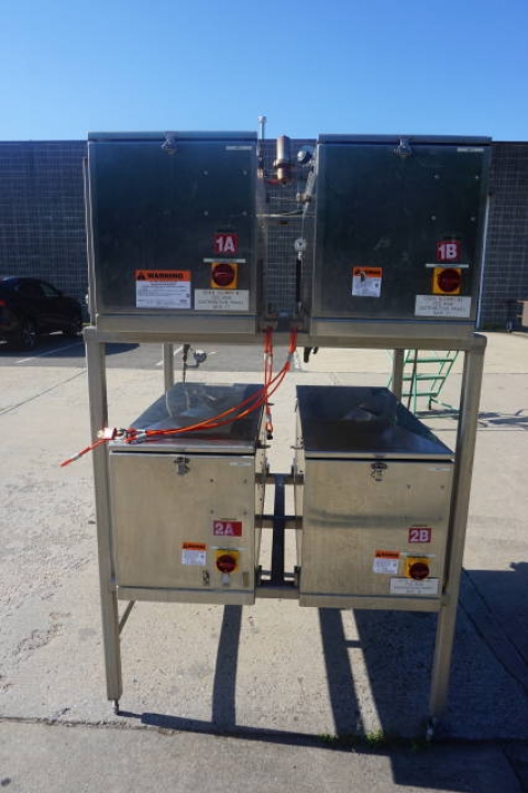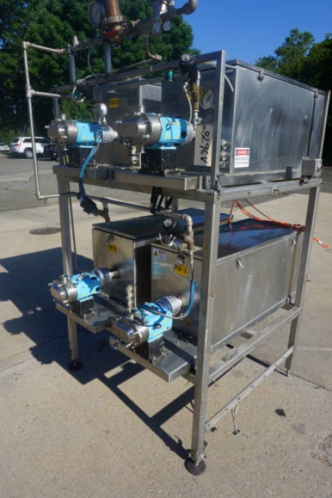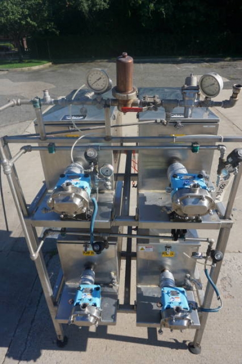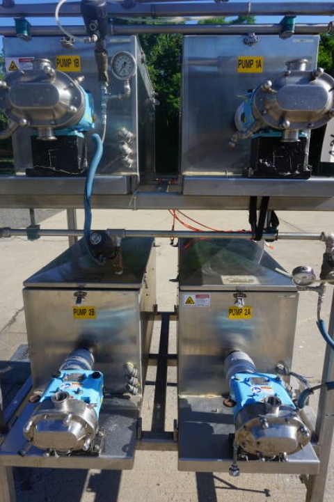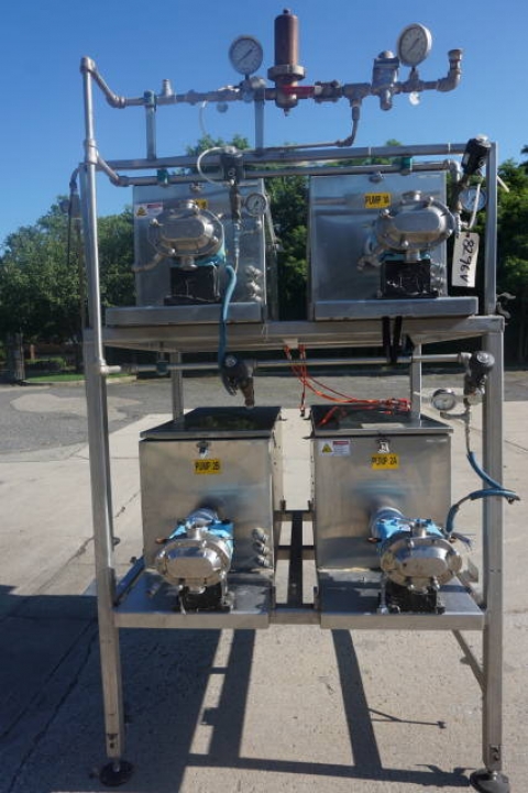 1-Used Battery of Four Waukesha Size 018-U2 Stainless Steel Positive Displacement Pumps. Four pumps are mounted in one framework and each is equipped with its own Servo motor and Allen Bradley Ultra 3000i controller. Each pump has 1 ½ In. diameter tri-clamp inlet and outlet ports. (Stock #8296V)