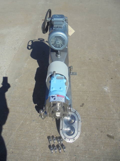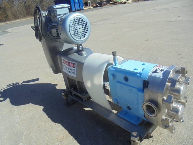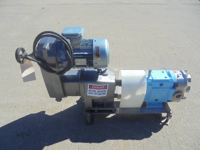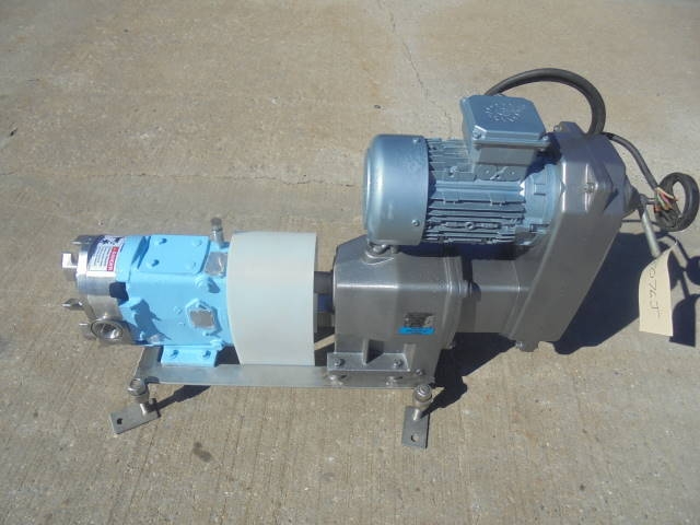 1-Used Waukesha Size 030 Stainless Steel Positive Displacement Pump, S/N 111333.  Driven by 1.5 HP 3/60/230-460 volt variable speed drive.  Mounted on base, Pump last used in food industry. (Stock #8076J)