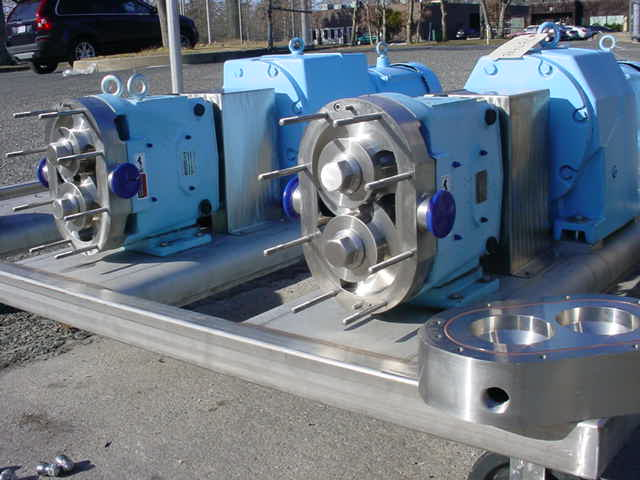 2-WAUKESHA MODEL 045U2 STAINLESS STEEL SANITARY JACKETED POSITIVE DISPLACEMENT PUMPS, S/Ns 348123-04 AND 348142-04. EQUIPPED WITH APPROX. 2" DIAMETER INLET AND OUTLET PORTS. BOTH PUMPS ARE INDIVIDUALLY DRIVEN BY 3 HP 3/60/230-460 VOLT TEFC MOTORS. PUMPS HAVE JACKETED HEADS AND ARE MOUNTED ON HEAVY DUTY STAINLESS STEEL PORTABLE STAND WITH CASTERS. EQUIPPED WITH STAINLESS STEEL STARTER BOX/CONTROL PANEL WITH INDIVIDUAL RELIANCE ELECTRIC DIGITAL CONTROLS FOR MULTIPLE FEATURES INCLUDING VARIABLE SPEED CONTROL. PUMPS CAN BE SOLD INDIVIDUALLY AS WELL. BOTH PUMPS APPEAR TO BE IN UNUSED CONDITION.