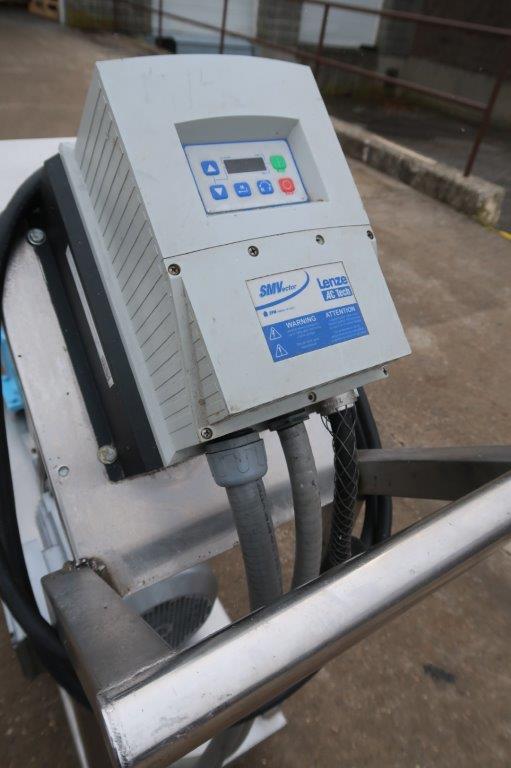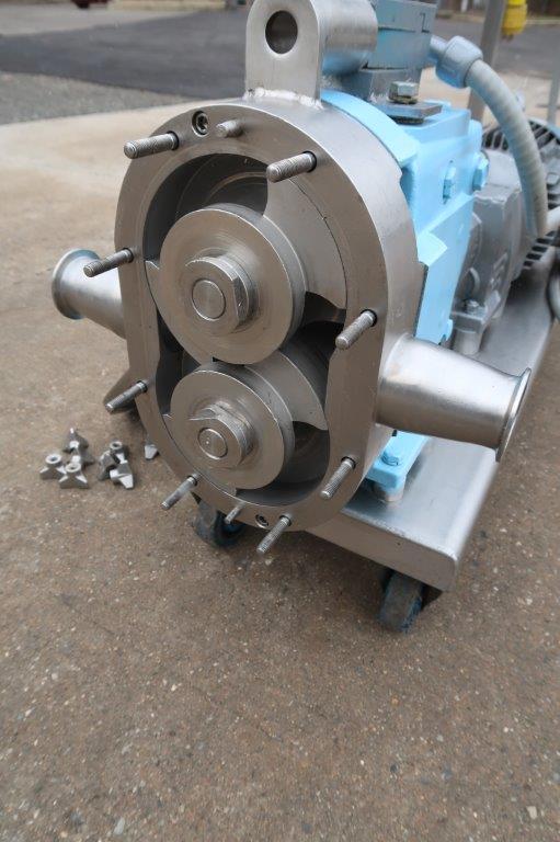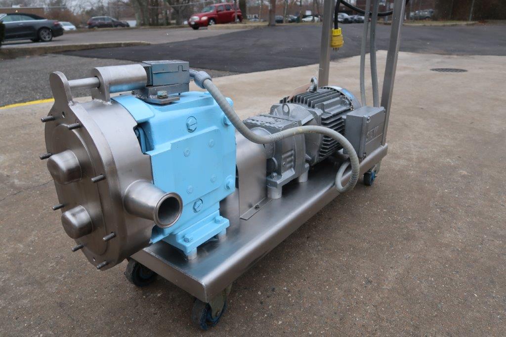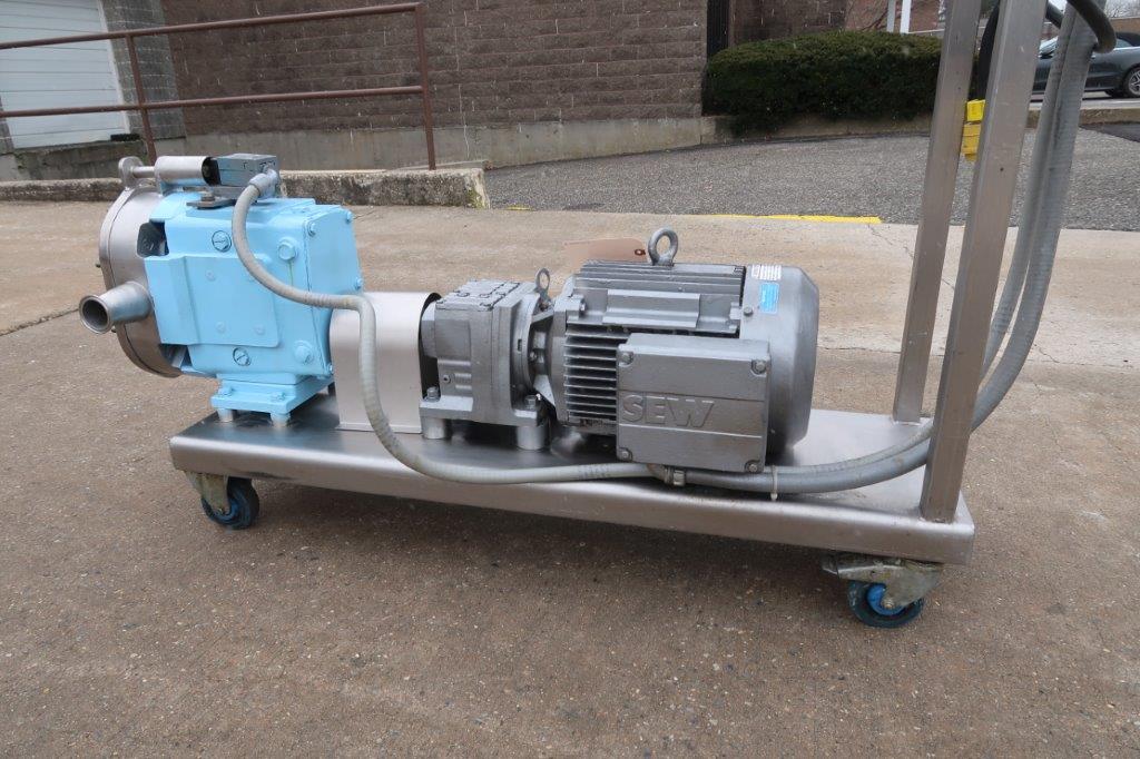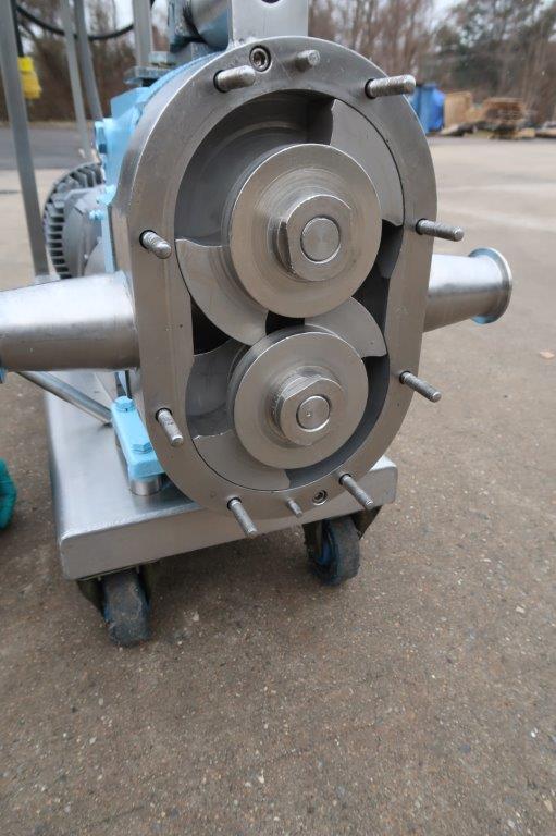 1-Used Waukesha/Cherry Burrell Model 060 U1 2009 Stainless Steel Positive Displacement Pump, S/N 1000002452871. Equipped with approximately 2 In. diameter tri-clamp inlet and outlet ports, pump is mounted on stainless steel portable base with casters. Drive by Eurodrive 10HP, 3/60/208 Volt motor, pump has Lenze AC Tech variable frequency drive. Can be supplied with emergency cut off switch in the event the front cover is opened, at additional cost. (Stock #8602A)
