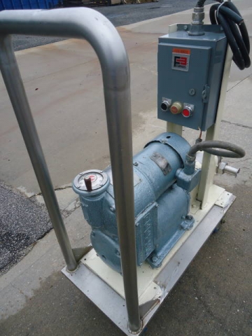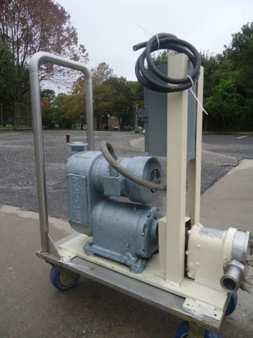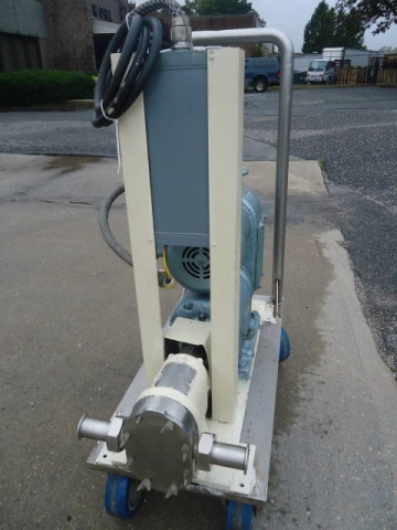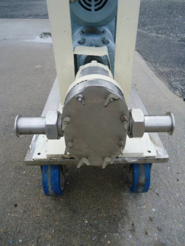 1-USED WAUKESHA SIZE 10 STAINLESS STEEL POSITIVE DISPLACEMENT PUMP, S/N WR10510SS. EQUIPPED WITH APPROX. 1-1/2 IN. DIAMETER TRI-CLAMP INLET AND OUTLET PORTS, PUMP DRIVEN BY REEVES 1 HP VARIABLE SPEED DRIVE. ON STAINLESS STEEL STAND WITH CASTERS, UNIT EQUIPPED WITH STARTER BOX. (STOCK # 6627EY)