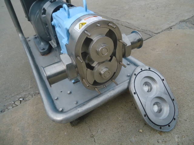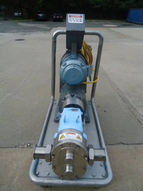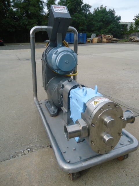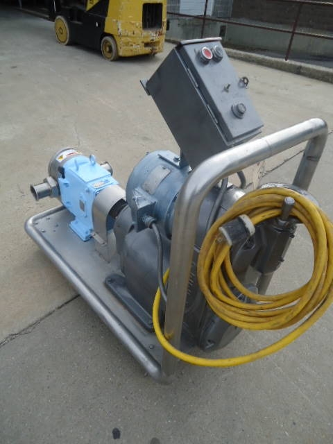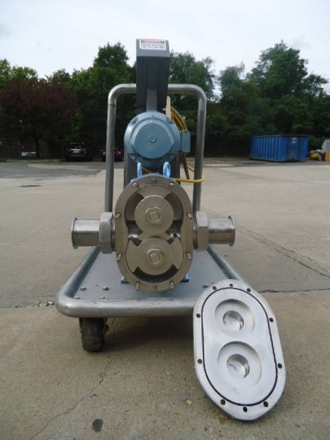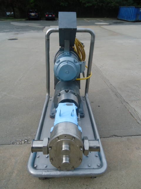 1-Used Waukesha Size 130 Stainless Steel Positive Displacement Pump, S/N 771850r2-95. Equipped with approx. 3 in. diameter Tri-Clamp Fittings. Pump on portable stainless steel base with casters. Driven by Reeves 5 HP 3/60/220-440 volt variable speed drive. Unit has pushbutton starter box. (Stock #7824B)