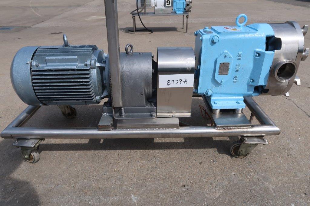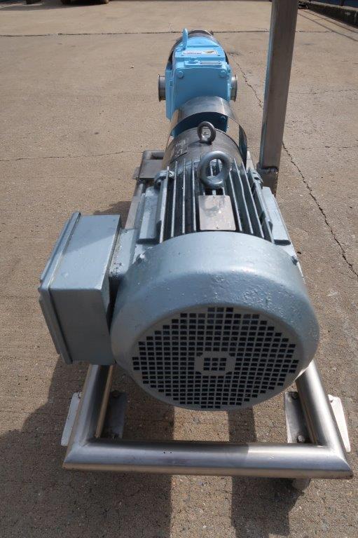 1 – Used Waukesha Model 130 Stainless Steel Positive Displacement, s/n 20053SS.  Equipped with approx. 3 In. diameter Tri-Clamp inlet and outlet ports, the pump is driven by and is on a common base with Eurodrive 10 HP 3/60/230-460 volt motor. Pump last used in the food industry. Equipped with variable speed drive for variable speed operation. (Stock # 8739A)