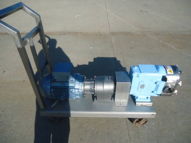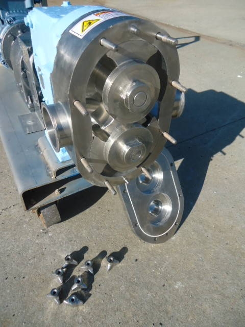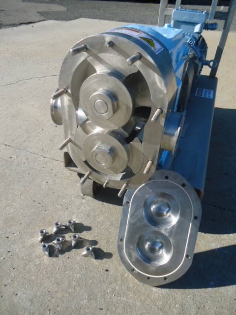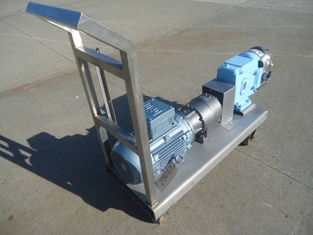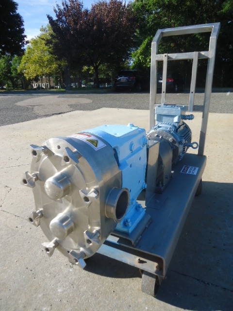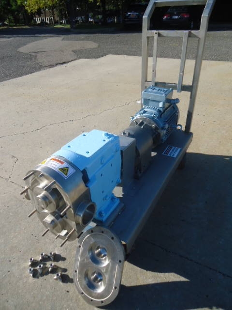 1-Used Waukesha Size 130 Stainless Steel Positive Displacement Pump, S/N 209907-97. Equipped with approx. 3 in. diameter Tri-Clamp inlet and outlet ports. Pump on portable stainless steel base with casters. Driven by approx. 10 HP 3/60/208-230-460 volt electric motor. (Stock #7824A)