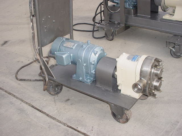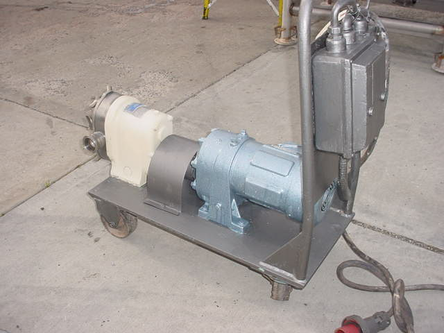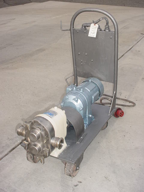 1-USED WAUKESHA SIZE 25 STAINLESS STEEL POSITIVE DISPLACEMENT PUMP, S/N D037750SS. EQUIPPED WITH APPROX. 2" DIAMETER INLET AND OUTLET PORTS, PUMP MOUNTED ON PORTABLE STAND WITH CASTERS AND ELECTRIC MOTOR AND STARTER.