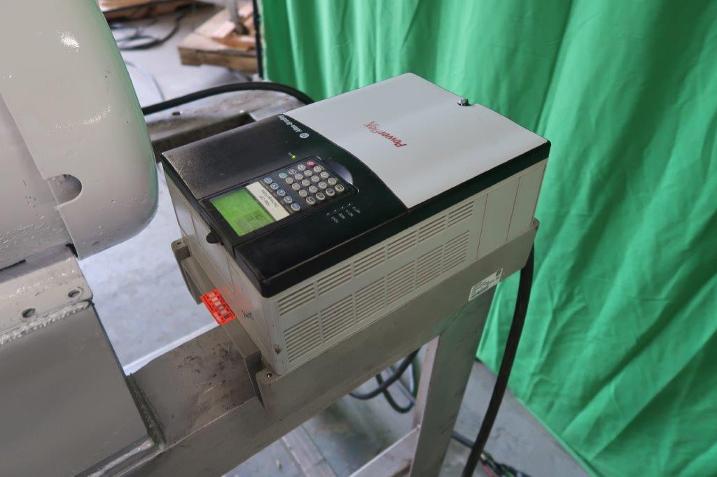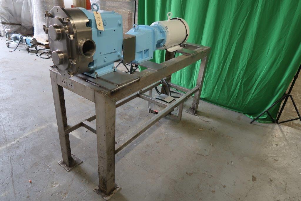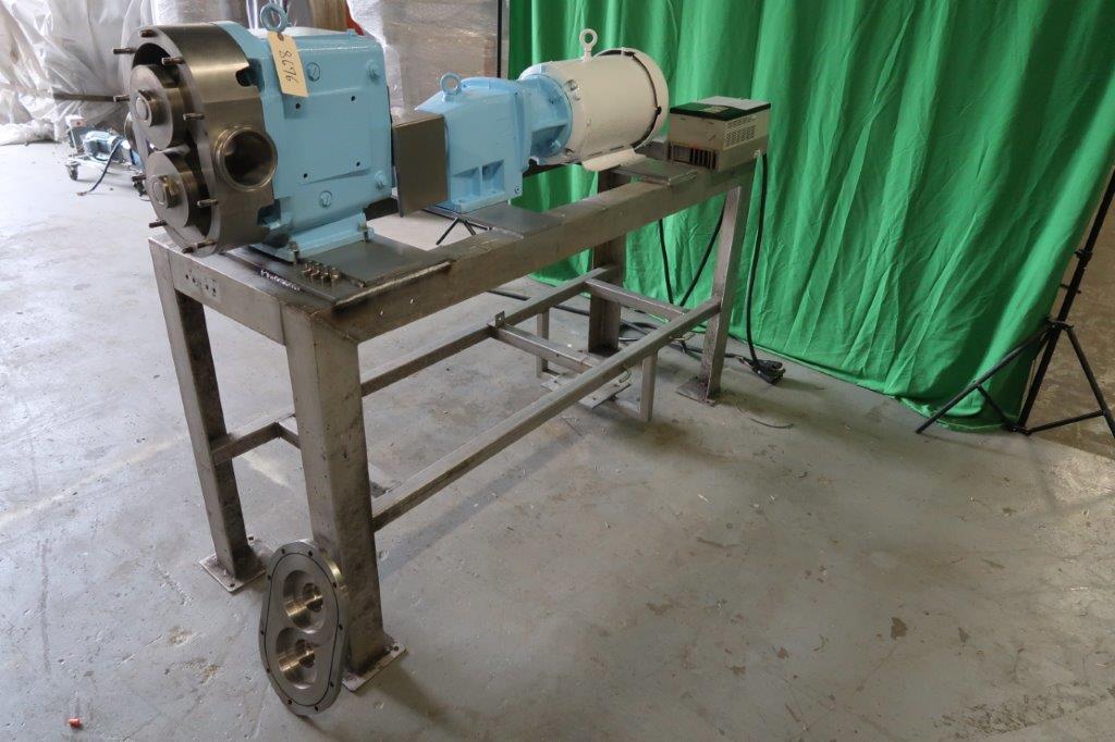 1-Used Waukesha Model 220 Stainless Steel Positive Displacement Pump, S/N 128544. Equipped with 4 In. diameter Tri-Clamp ports, pump is mounted on stainless steel stand and is driven by 15 HP 3/60/230-460 Volt motor. Equipped with Allen Bradley “Powerflex 70” Variable Frequency Drive. Last used in Food Production (Stock #8676)