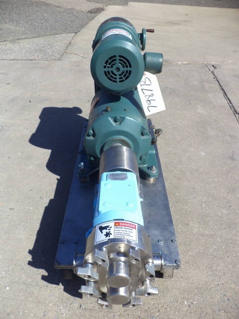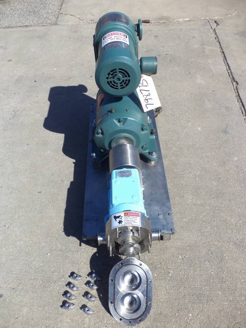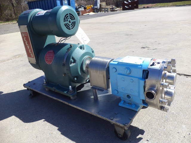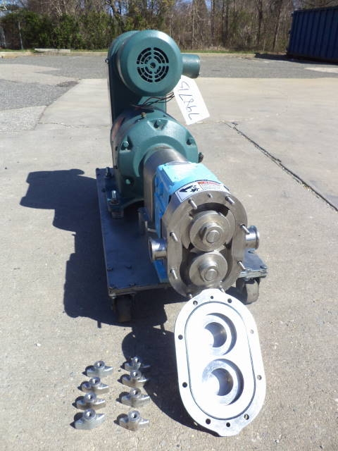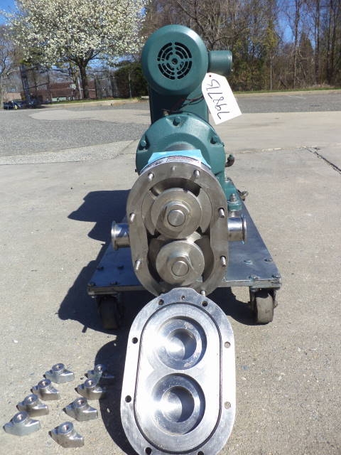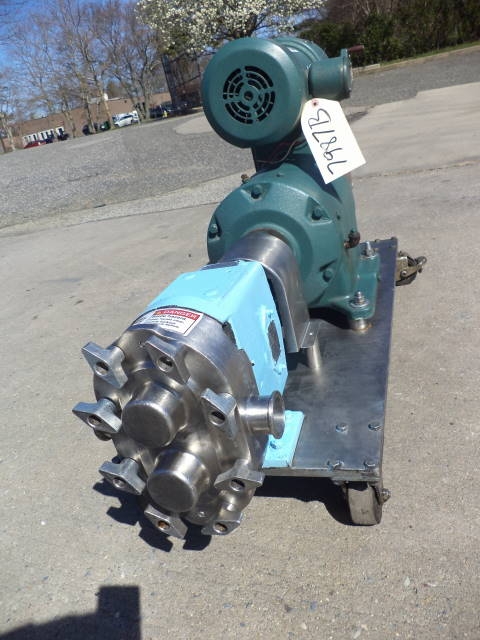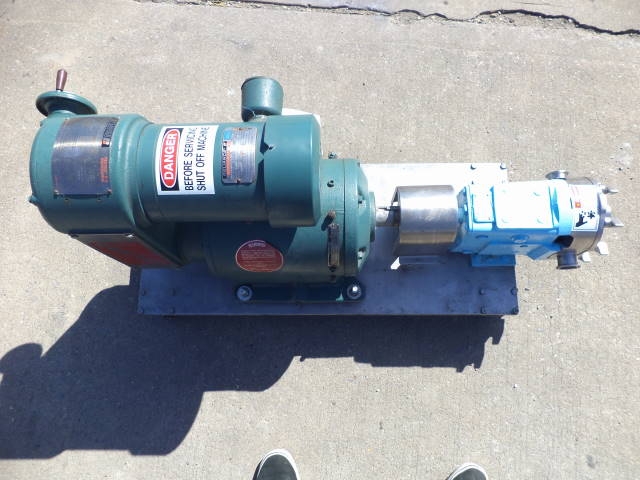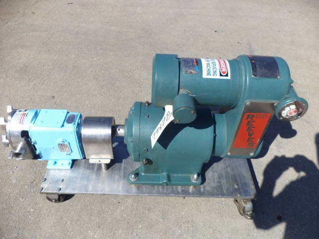 1-Used Waukesha Model 30 Stainless Steel Positive Displacement Pump, S/N 16278SS. Equipped with approximately 1.5 in. diameter tri-clamp inlet and outlet ports, pump is on stainless steel base with casters for portability. Driven by Reeves 1.5HP 3/60/230-460 Volt variable speed drive. (Stock #7987B)