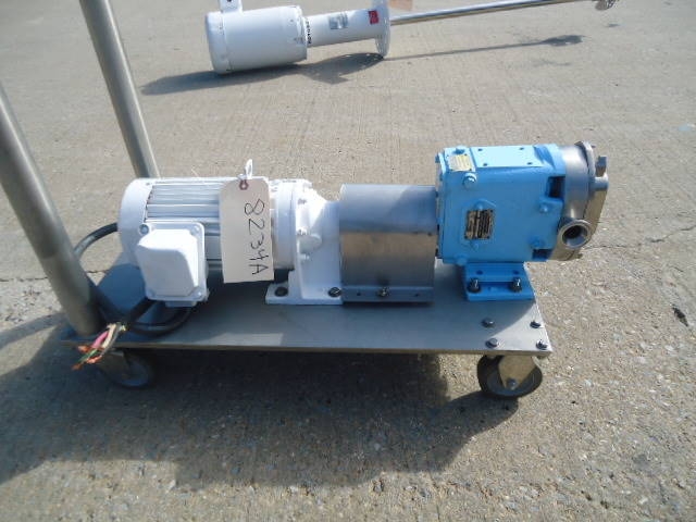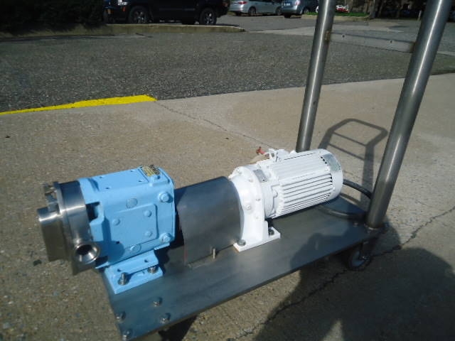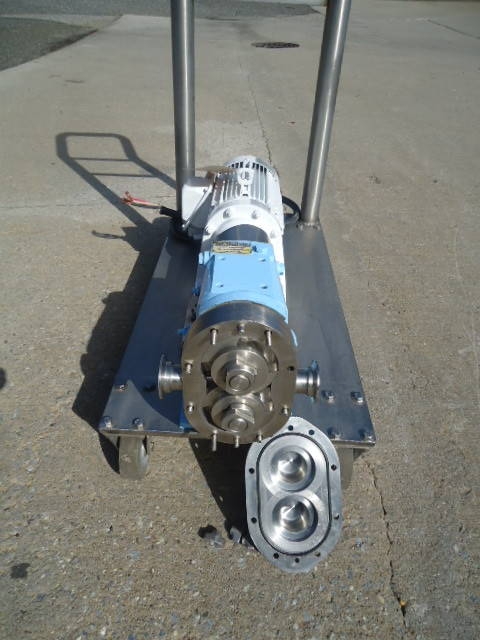 1-Used Waukesha Size 015 Stainless Steel Positive Displacement Pump, S/N 87099S. Mounted on portable stainless steel base with casters, Pump has approx. 1-1/2 in. outside diameter inlet and outlet tri-clamp ports. Driven by 3/4 HP 3/60/230-460 volt motor. (Stock 8234A)