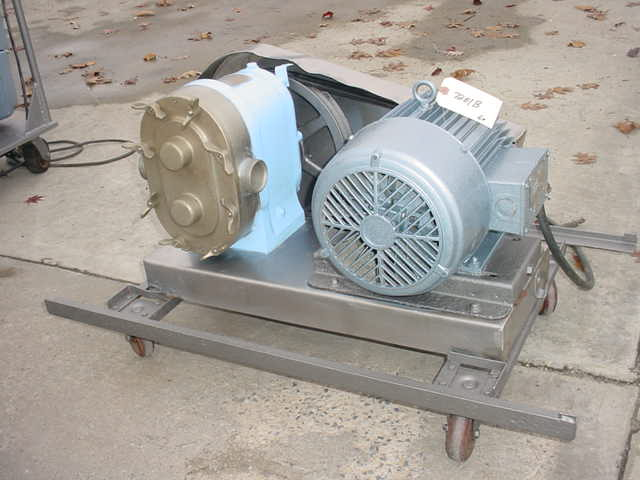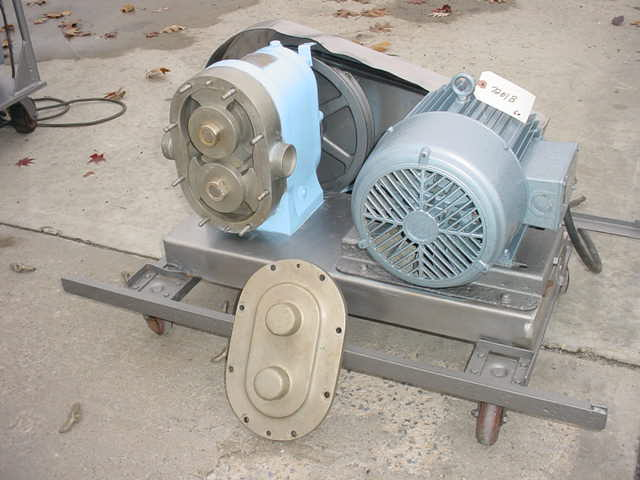 1-USED WAUKESHA SIZE 55 POSITIVE DISPLACEMENT PUMP, S/N DO17662RI. EQUIPPED WITH APPROX. 2" DIAMETER INLET AND OUTLET PORTS. ON PORTABLE BASE WITH CASTERS, PUMP IS DRIVEN BY 3 HP 3/60/230-460 VOLT MOTOR.