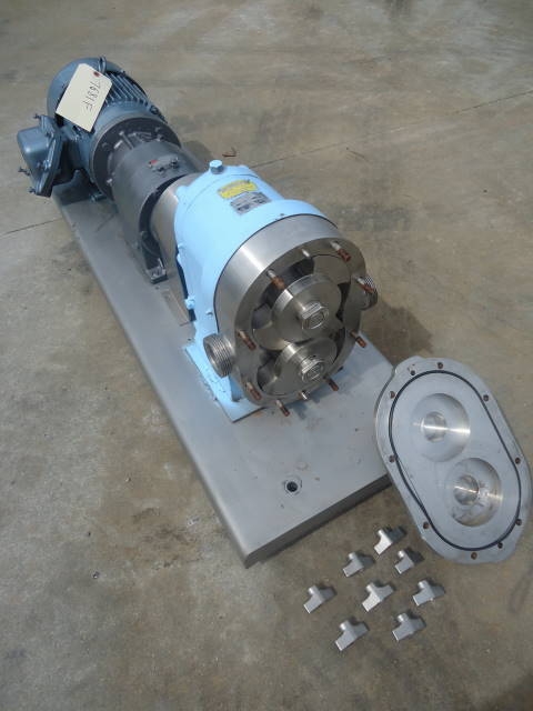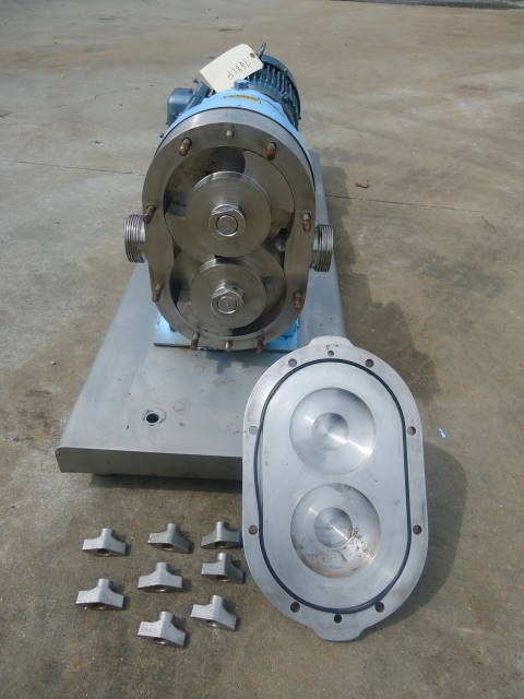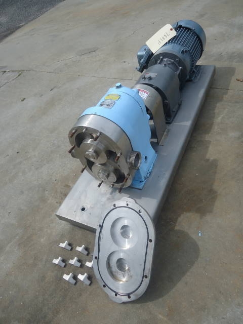 1-Used waukesha size 55 stainless steel positive displacement pump, s /n do78559ss. Equipped with inlet and outlet ports each measuring approx. 2 in. Diameter. On stainless steel portable base with casters. Pump is driven by 5 hp, 3 phase, 60 cycle, 230-460 volt motor. (stock #7681f)