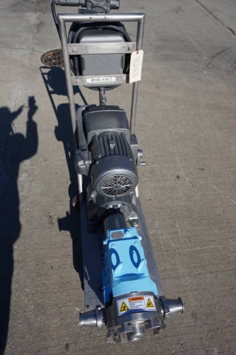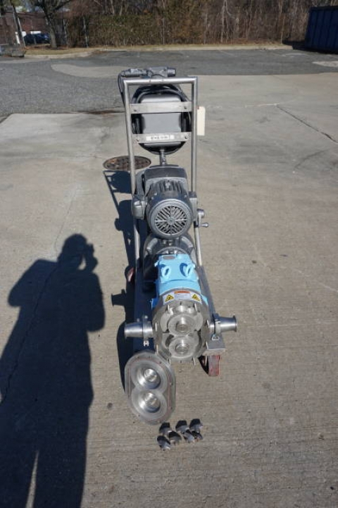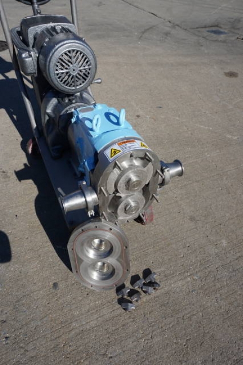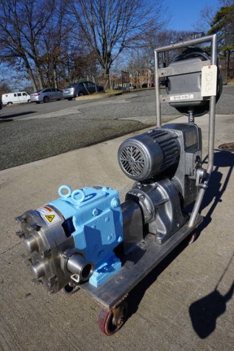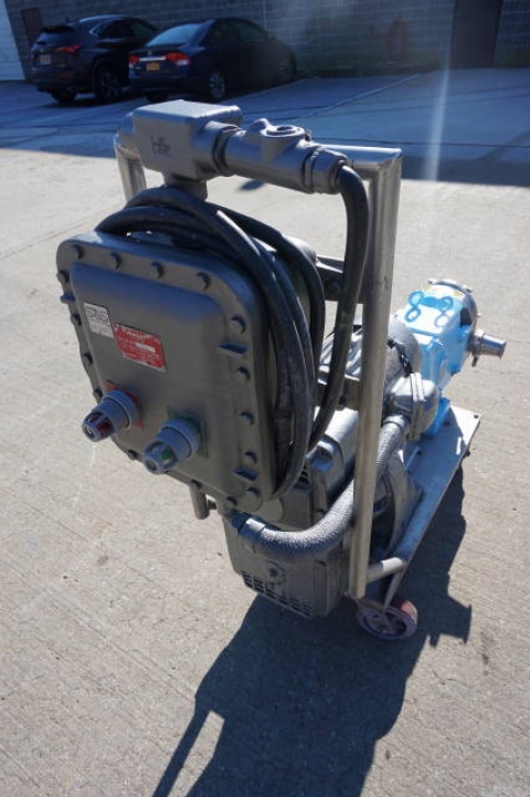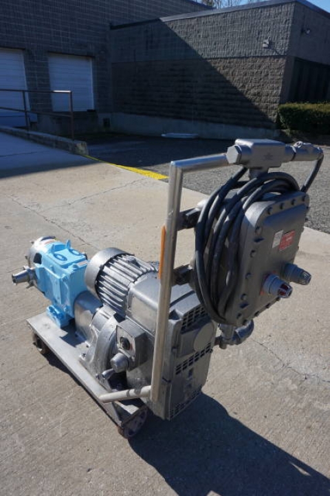 1-Pre-Owned Waukesha Model 60 Stainless Steel Positive Displacement Pump, S/N 153534R10. Equipped with approx. 2-1/2 in. diameter tri-clamp inlet and outlet ports. Pump on portable stainless steel base with casters, and is driven by 3 HP 3/60/208-220-440 volt explosion proof variable speed drive. Last used in food industry. (Stock # 8263)