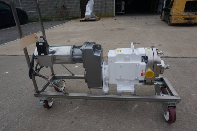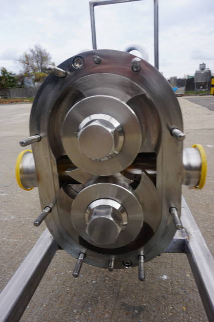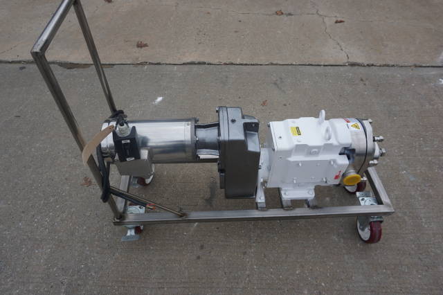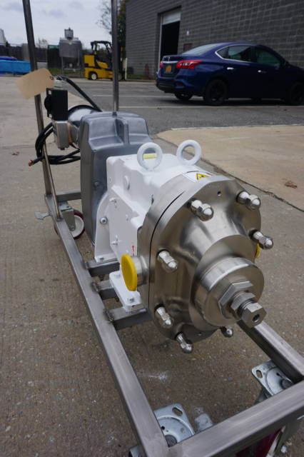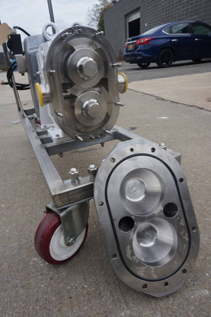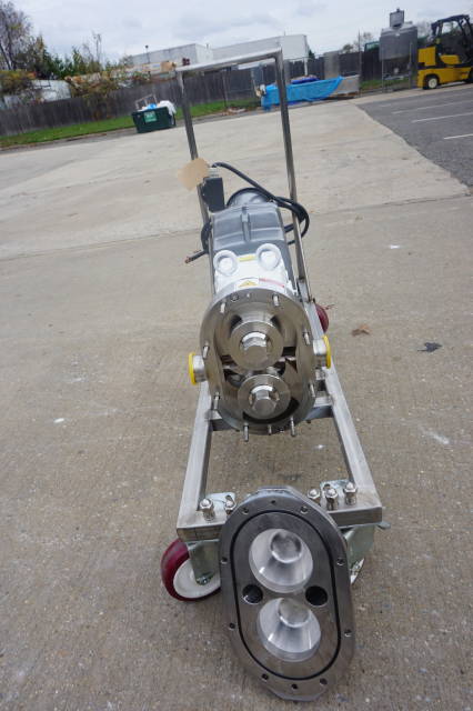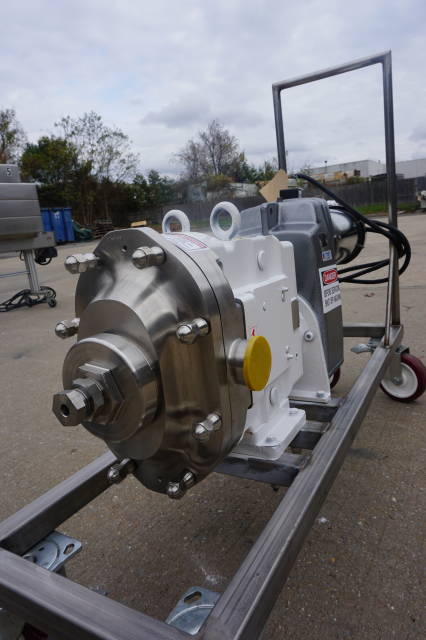 1-Pre-Owned Wright Model 0450-TRA20 Stainless Steel Positive Displacement Pump, S/N 06L4309,  Equipped with approx. 2 in. diameter inlet and outlet ports, Pump driven by 2 HP 3/60/208-230 volt stainless steel motor.  Mounted on portable stainless steel base with casters, Pump has vented front cover.  (Stock #8319H)