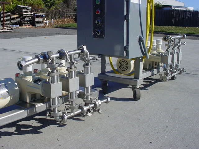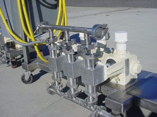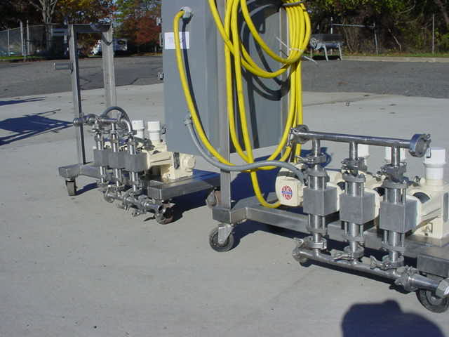 1-USED BRAN & LUEBBE 3 HEAD METERING/PROPORTIONING PUMP, TYPE VE-P33, S/N A10507 AND A11360. EACH DRIVEN BY 1 HP 3/60/208-230-460 VOLT "WASH DOWN" MOTORS. MOUNTED ON STAINLESS STEEL PORTABLE BASE WITH CASTERS.