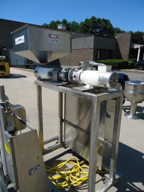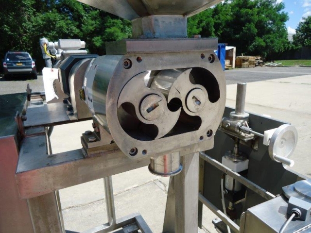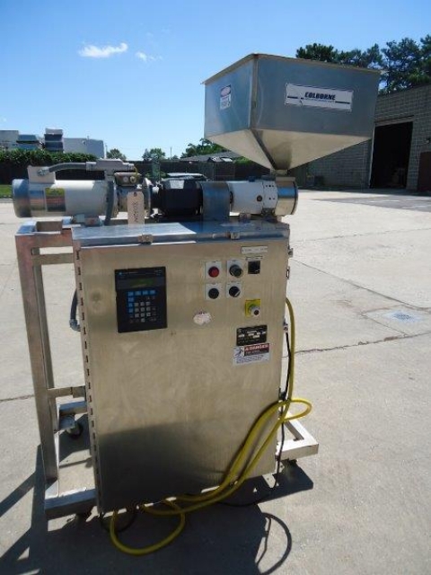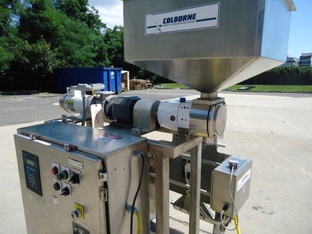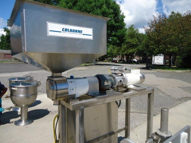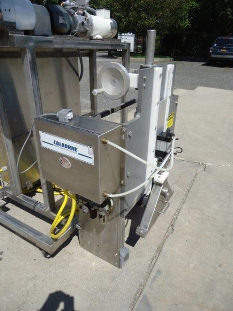 1-Used Colborne Positive Displacement Rotary Pump Filler equipped with Jabsco “Hy-Line” Pump Model LH54H-1890. Pump mounted on portable stainless steel stand with casters and has approx. 22 in. X 24 in. stainless steel product hopper. With approx. 2 in. sanitary discharge port, Pump has Allen Bradley SLC 500 PLC Controller with Allen Bradly DTAM Plus Controller. Supplied with Colborne Model YX1200 Icing Air Operated Spreader. Icing Spreader can mount over customer’s Conveyor for depositing/spreading icing onto product. (Stock #8022N)