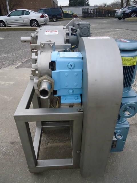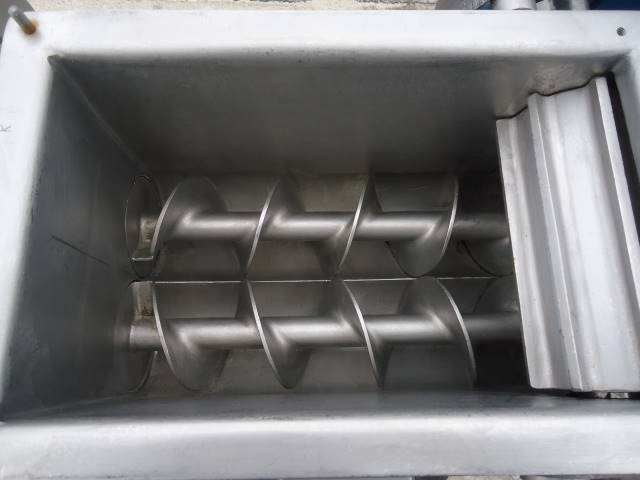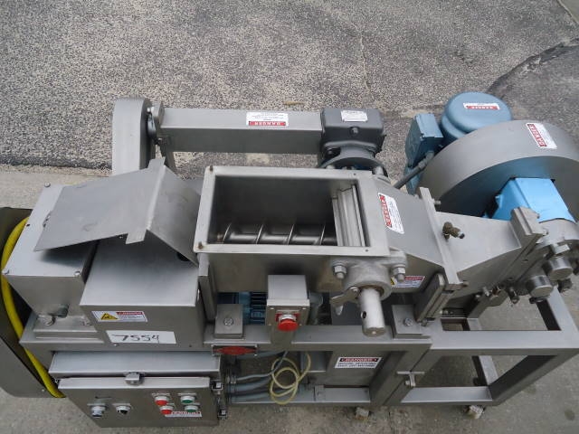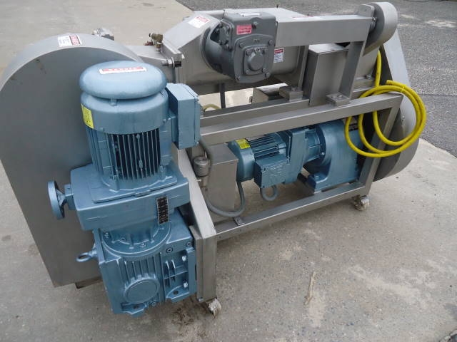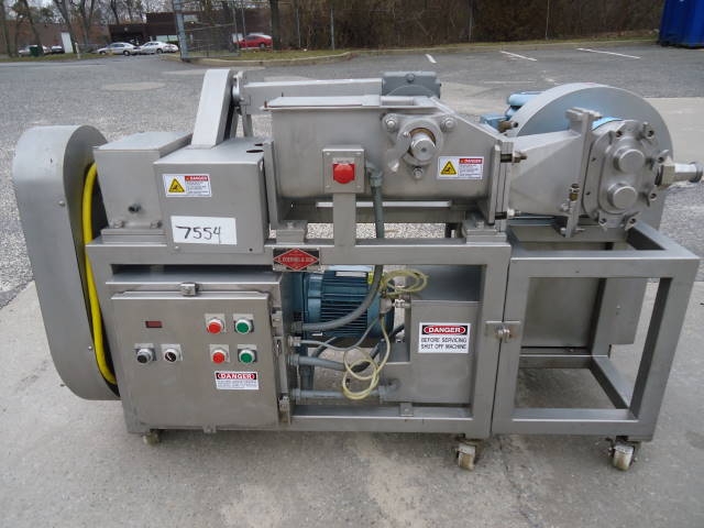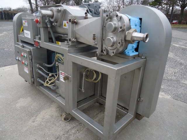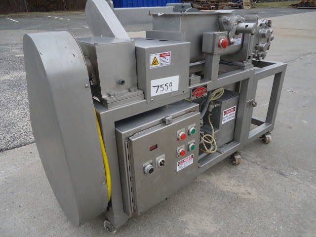 1-USED DOERING & SON MODEL 35PF STAINLESS STEEL TWIN SCREW PUMP FEEDING SYSTEM, S/N 8604.  DESIGNED FOR PUMPING EXTREMELY VISCOUS PRODUCTS IN THE FOOD INDUSTRY,.  MACHINE IS DRIVEN BY EURODRIVE VARIABLE SPEED MAIN DRIVE AND ALSO HAS WAUKESHA SIZE 30 POSITIVE DISPLACEMENT PUMP SEPARATELY DRIVEN BY EURODRIVE VARIABLE SPEED DRIVE.  WITH TOP FEED HOPPER WITH TWIN FEED SCREWS, MACHINE HAS STAINLESS STEEL STARTER BOX AND IS MOUNTED ON STAINLESS STEEL PORTABLE BASE WITH CASTERS.  SUITABLE FOR PRODUCTS LIKE FROZEN GROUND MEAT, SAUSAGE, TORTILLA DOUGH, CHEWING GUM, WHOLE FRUITS AND VEGETABLES AND OTHER SIMILAR VISCOUS PRODUCTS.  (STOCK # 7554)