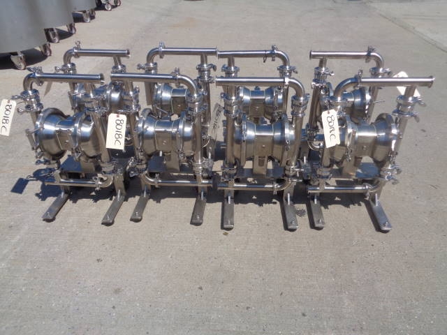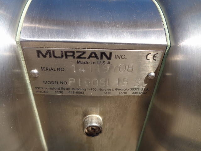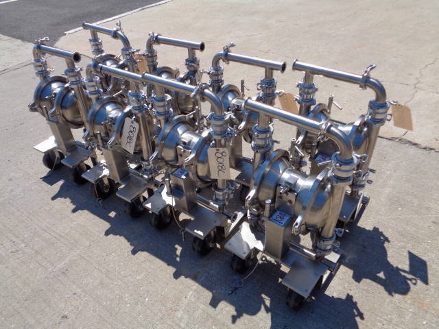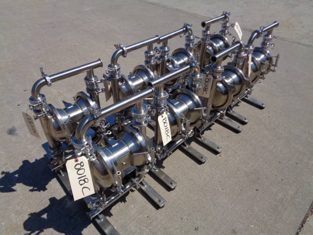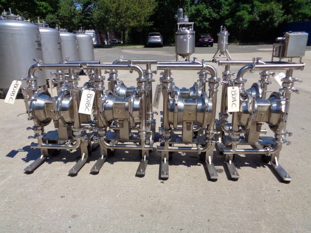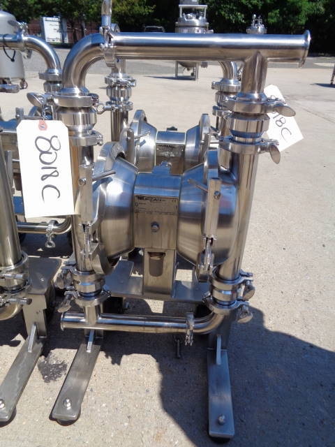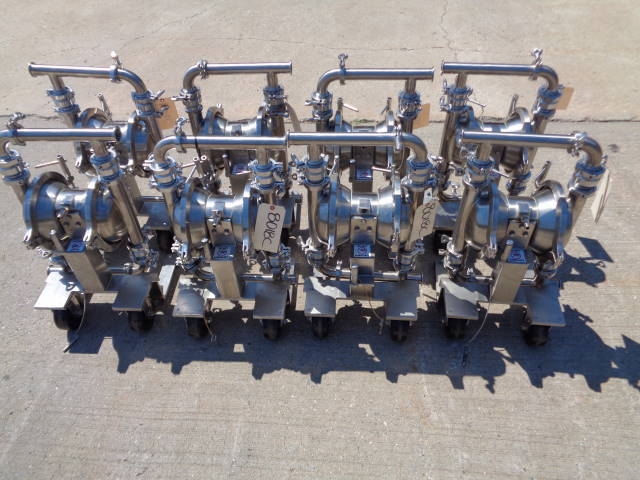 2-Murzan Model PI50-SL-1B-SC Type 316 Stainless Steel Air Operated Sanitary Double Diaphragm Pump. This 2 inch diameter pump (presently with 1.5 inch tri-clamp fittings, which can be removed) is USDA and FDA approved and is manufactured to meet general 3-A standards. Pump is mounted on portable stainless steel base with casters. Pump is easy to sterilize and CIP able. Able to pump very viscous products, this pump can be used in a wide assortment of food products, as well as related industries. (Stock #8018C)